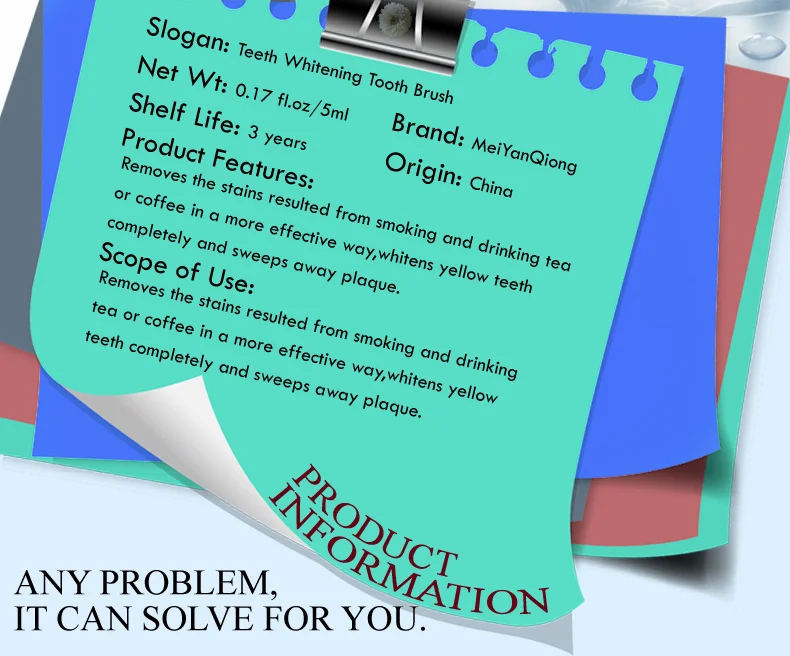 Отбеливающая зубная щетка нетто Wt: 0,17 fl.oz / 5 мл характеристики продукта: удаляет пятна, вызванные курением и питьем чая или кофе, более эффективным способом, полностью отбеливает желтые зубы и Удаляет налет. Ленивый дизайн зубной щетки, легко носить с собой. Аккуратно протрите, чтобы ваши зубы блестели, отбеливая.