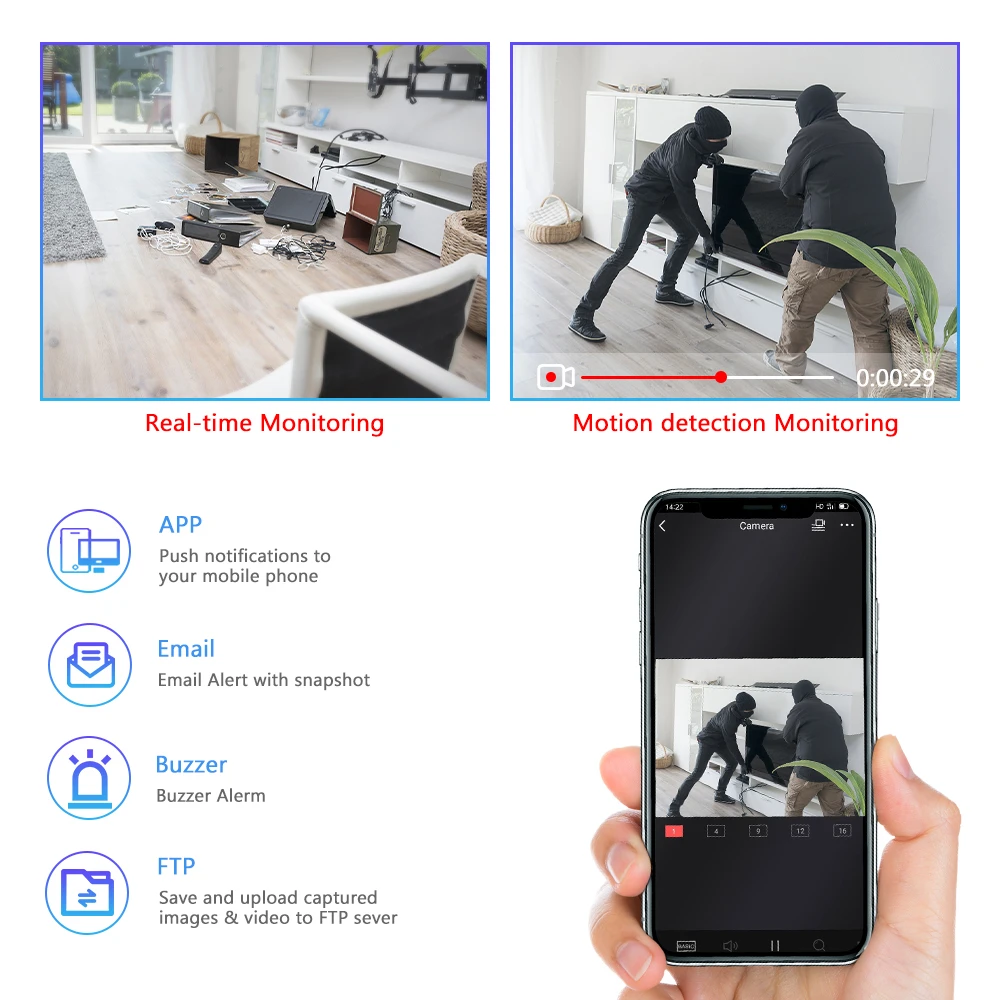 (При обнаружении motion, он может отправить электронное письмо/push-сигнал/начать запись/отправить изображение на FTTP/Buzzer., и т. Д., так что вы можете узнать сигнал тревоги в первый раз)