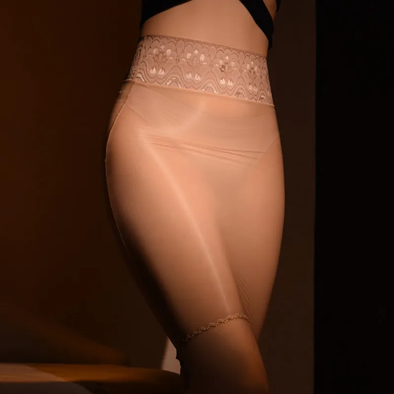 Масляная блестящая кружевная нейлоновая юбка-карандаш с завышенной ...