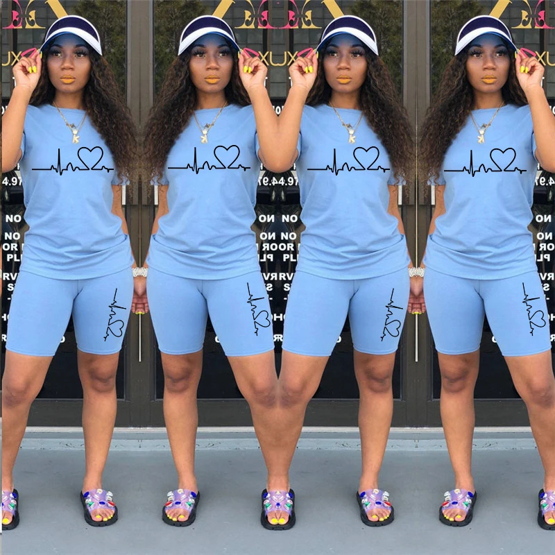 Повседневный Спортивный костюм для женщин, комплект из двух предметов, летние футболки и шорты, однотонный топ с принтом и коротким рукавом, женские костюмы
