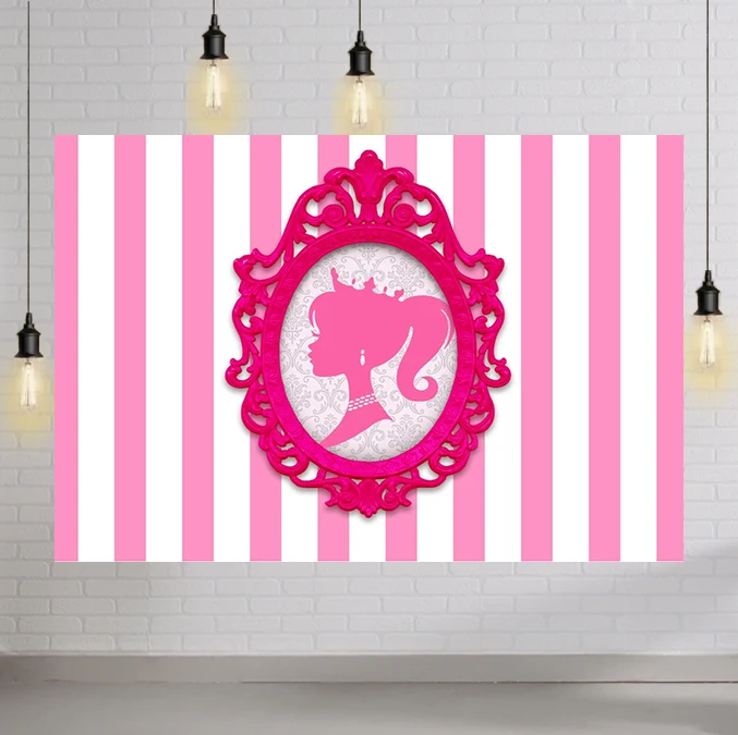 Фон с розовыми белыми полосками, голова куклы, фоторамка, гламур, девушка, фотография, декор для вечеринки, баннер для киоска, торт, стол