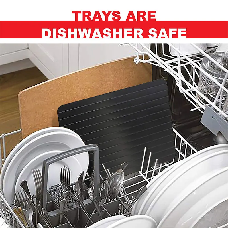 1. Рекомендуется ручная стирка. Сейф для посудомоечной машины. 2. Не используйте проволочные щетки или стальную шерсть для очистки поверхности, чтобы избежать повреждения антипригарной поверхности и уменьшения эффекта размораживания. 3. Удалите еду из упаковки перед размещением на лотке для достижения наилучших результатов. 4. Время размораживания зависит от толщины пищи. 5. Используйте теплую воду, чтобы быстро разморозить краску, время разморозки быстрее.
