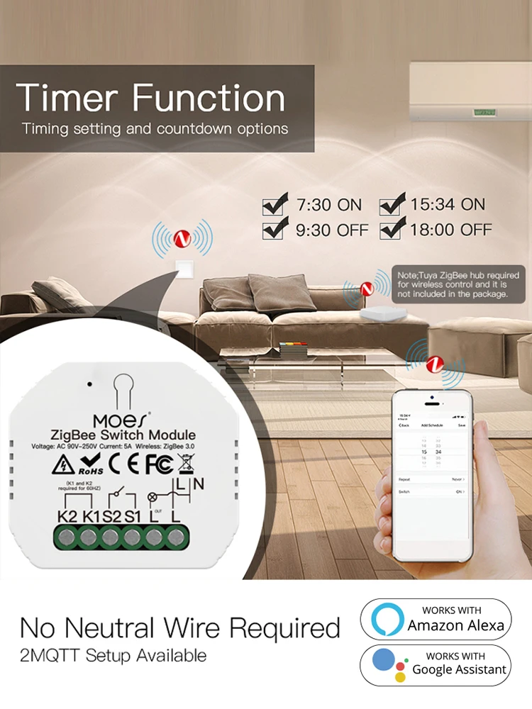 1. Этот умный модуль Tuya ZigBee 3,0 разработан специально с протоколом ZigBee 3,0, совместим с hub Tuya ZigBee (также поддерживается SmartThins) для реализации всей связи вашего дома, действительно хорошая замена нестабильному Wi-Fi. Протокол ZigBee 3,0 с мини-дизайном для коробки ЕС/настенный переключатель стандарта Великобритании, И легко впишется в настенная коробка переключателей вашего традиционного переключателя без какого-либо влияния на ваш стиль украшения, чтобы сделать его умным, предоставление вашим устройствам максимального включения/выключения интеллектуального преобразования и преобразования большинства совместимых продуктов в интеллектуальные; Традиционный переключатель и этот умный модуль могут работать независимо без помех. (Примечание: Этот модуль подходит только для переключателя, подробности см. В 2.)