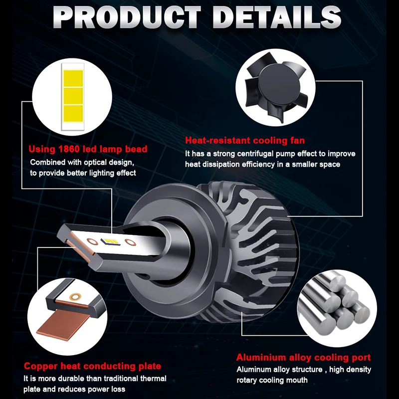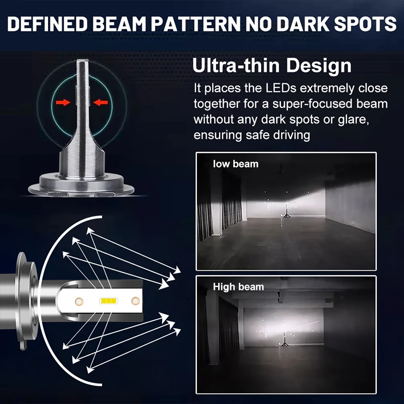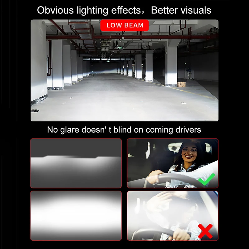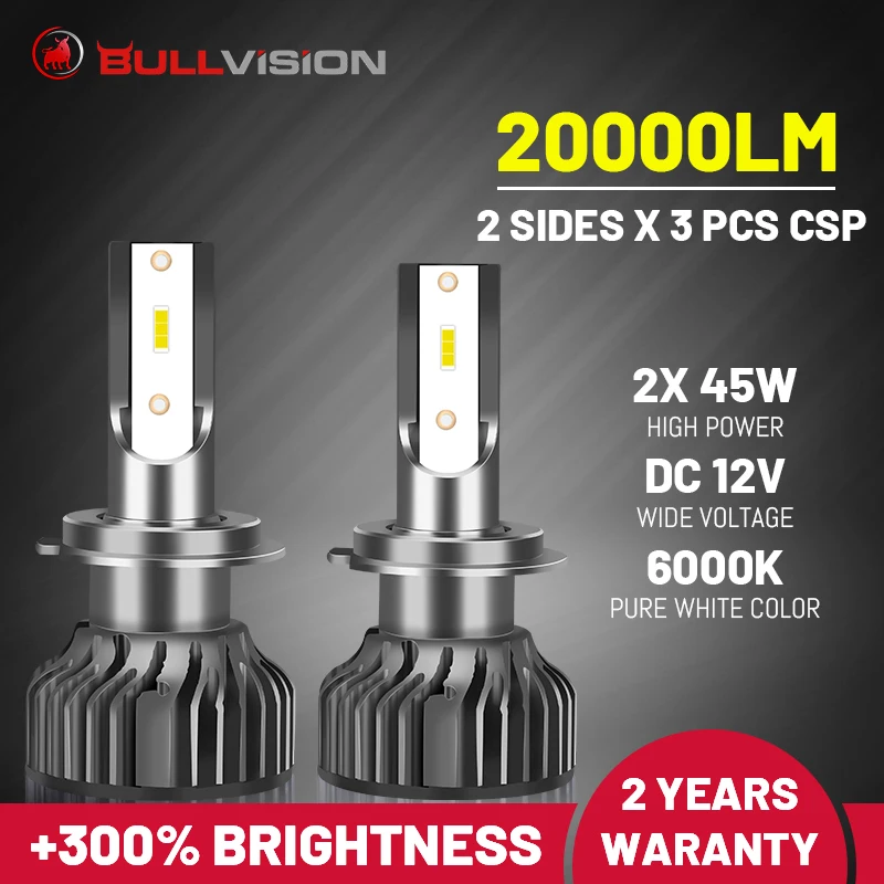 (1) светодиодная фара 20000LM/пара, каждая лампа 10000lm, супер яркая.(2) один светильник имеет 2 стороны 3 шт CSP чипы.(3) Этот продукт 6000k, чисто белый светильник.(4) Мощность этого продукта составляет 90 Вт/пара, каждая лампа-45 Вт.