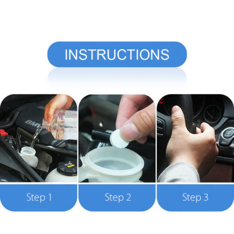 Инструкции по использованию: Этот продукт подходит для температуры выше нуля градусов Цельсия. Откройте капот автомобиля, найдите стеклоочистителя, добавьте кусок стеклоочистителя (если стекло слишком грязное, рекомендуется добавить 2 шт.), подождите 5 минут, а затем используйте его в обычном режиме. Кусочек обычной воды можно обменять на 4л воды. В соответствии с нормальным объемом резервуаров для хранения жидкости, это кусок воды, который может заменить и превосходить традиционную стеклянную воду!
