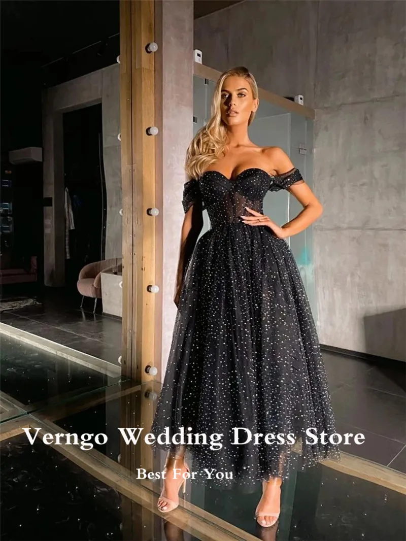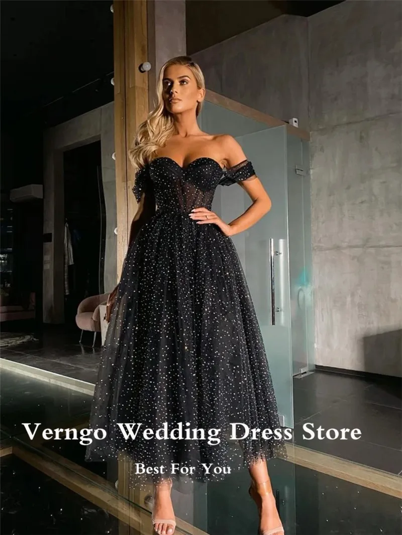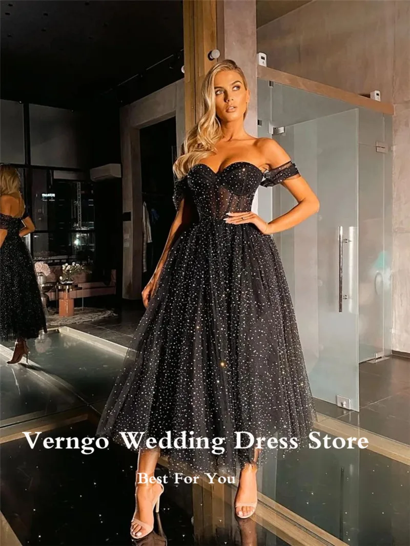 Verngo 2021 блестящее черное Тюлевое вечернее платье с открытыми плечами короткие платья для выпускного вечера вечерние платья длиной ниже колена официальное платье