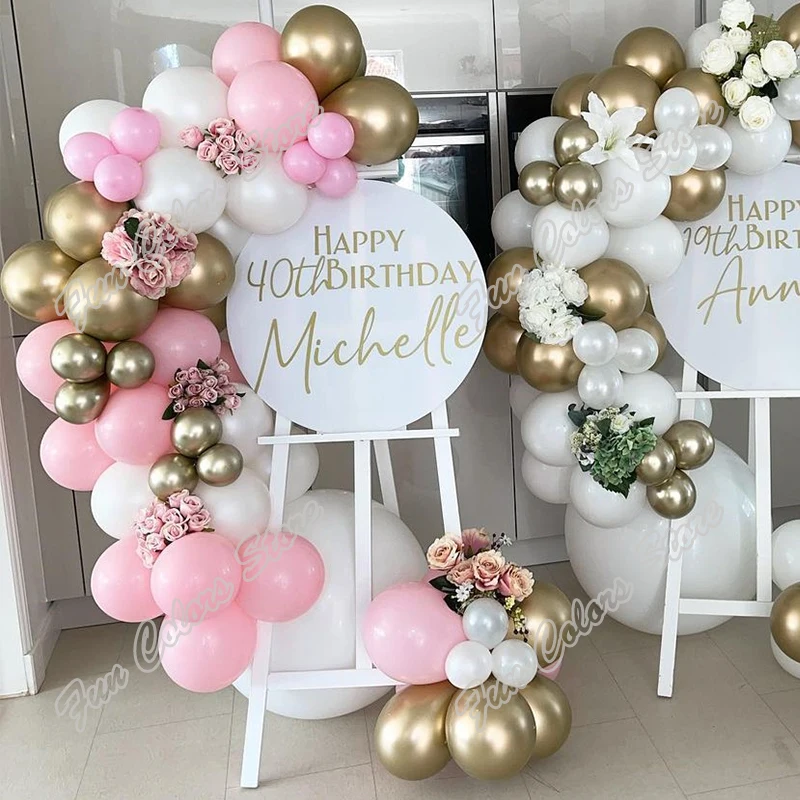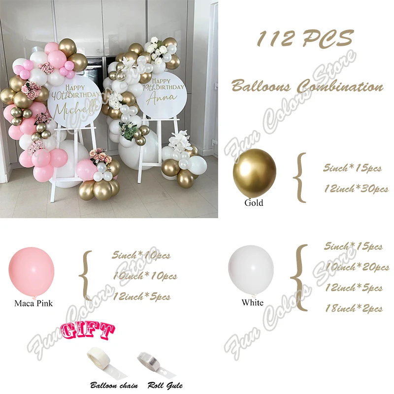 Розовый мака (5 дюймов * 10 шт, 10 дюймов * 10 шт, 12 дюймов * 5 шт)Золото (5 дюймов * 15 шт, 10 дюймов * 30 шт)Белый (5 дюймов * 15 шт, 10 дюймов * 20 шт, 12 дюймов * 5 шт, 18 дюймов * 2 шт)Бесплатно: цепочка для воздушных шаров 5 м * 1Воздушный клей * 100