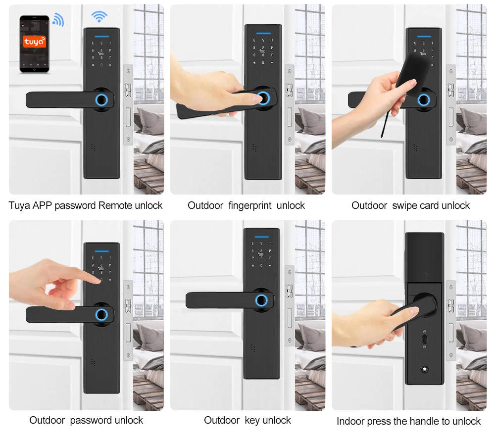 1. Приложение/отпечаток пальца/Пароль/смарт-карта/разблокировка ключа2. Просмотр журналов доступа из приложения3. Поддерживает обычный открытый режим (свободный доступ)4. Размер врезного замка5. Английский Голос6. Панель для волочения проволоки7. Матовый корпус8. Универсальные как для правой, так и для левой двери