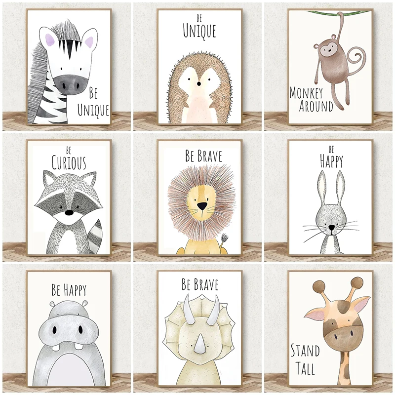 Мультяшные животные, скандинавский постер, настенное фото, Лев, слон, детский сад, Картина на холсте, роспись, искусство, картина, украшение комнаты для девочки