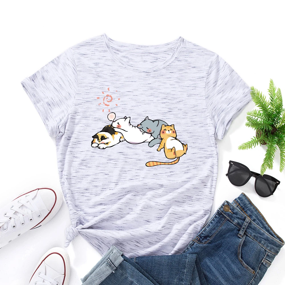 Футболка женская хлопковая с коротким рукавом, топ с принтом ворса и кошки, модная Милая рубашка с круглым вырезом, черный цвет, на лето