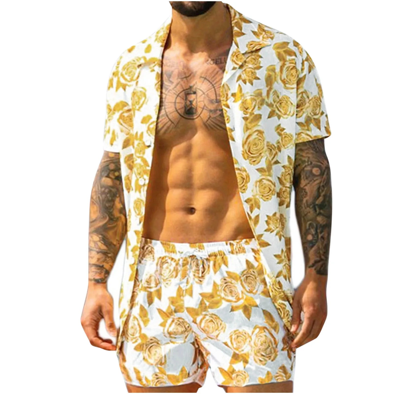 Гавайский пляжный комплект для мужчин, Модный комплект в стиле хип-хоп, Летняя Повседневная рубашка с коротким рукавом и цветочным принтом, комплект из двух предметов
