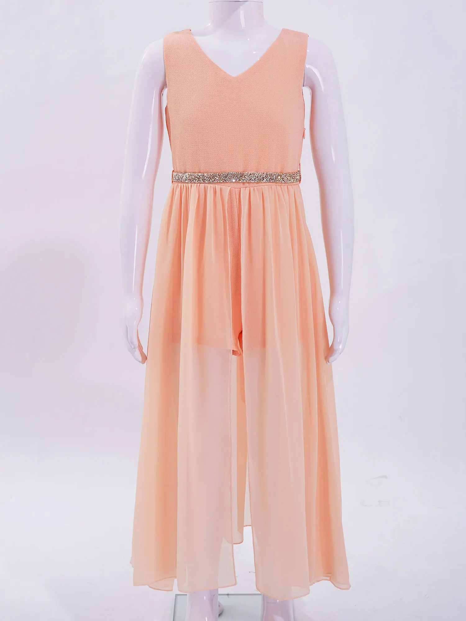 Особенности:Платье-комбинезон изготовлено из полиэстера и шифона, ручная стирка.Таблица размеров означает возраст для девочек, но только для общего руководства.Без рукавов, с v-образным вырезом и застежкой на пуговицы; Лиф с атласной подкладкой для комфортного ношения. Замочная скважина сзади. Скрытая застежка-молния сбоку.1 слой Макси-длины с шифоновым наложением крепится вокруг талии. Поставляется с Стразы ремень для завершения установки. В комплект входит: Красивое и стильное платье для вашей девочки.Идеально подходит для школьных танцев, дней рождения, праздников, фотосессий, официальных мероприятий или других особых случаев.