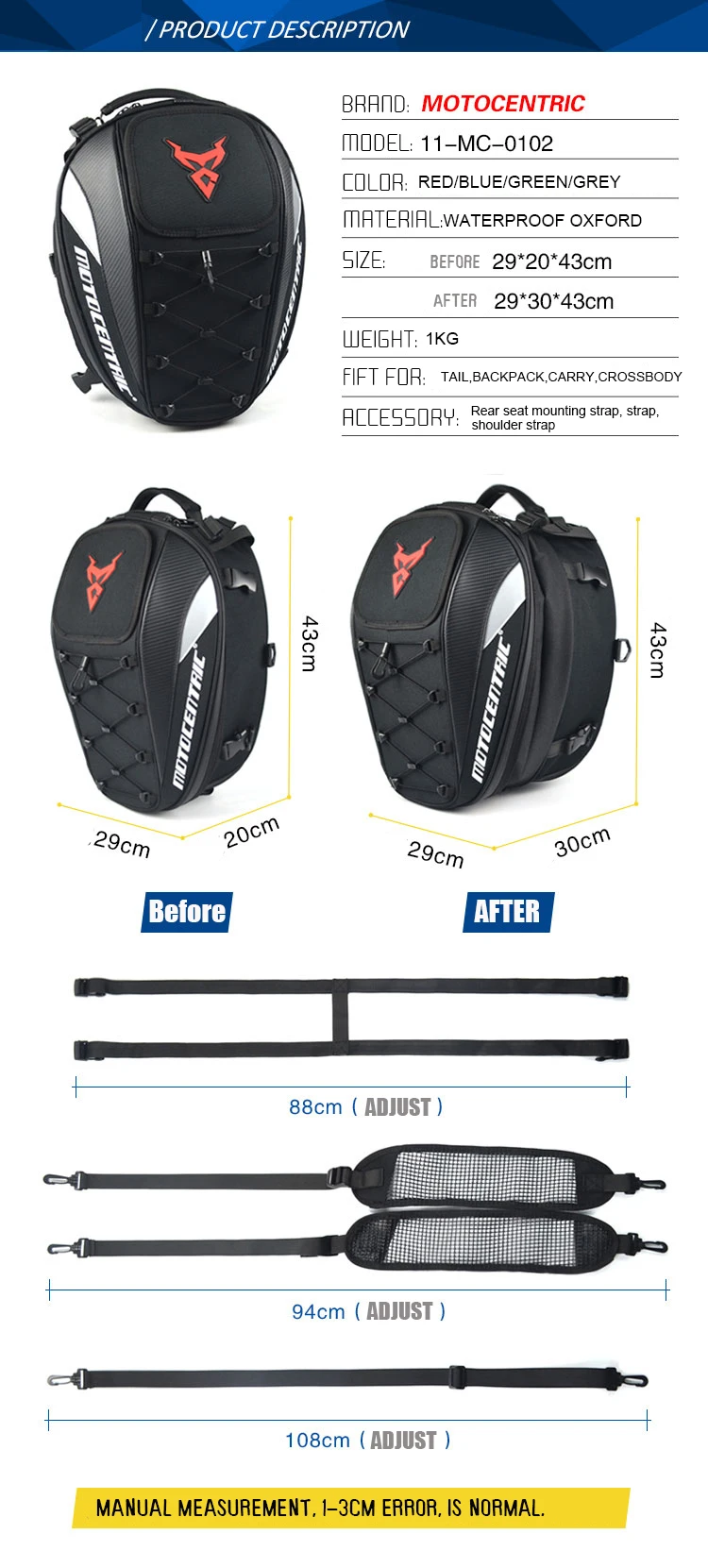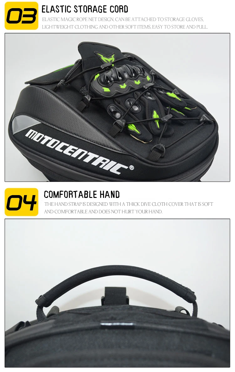 Модель A Цвет: красный, синий, зеленый, светоотражающий материал: утолщенная водоотталкивающая ткань Оксфорд + углеродное волокно Размер узора (прибл.): до: 29*20*43 см/11,42*7,87*16,93 дюйма. После: 29*30*43/11.42*11,81*16,93 дюйма. Вес: около 1 кг применимо: хвост, рюкзак, сумка-тоут, аксессуары для Кроссбоди: ремень для установки спинки, ремень, плечевой ремень, посылка список: 1 сумка для мотоцикла модель A:
