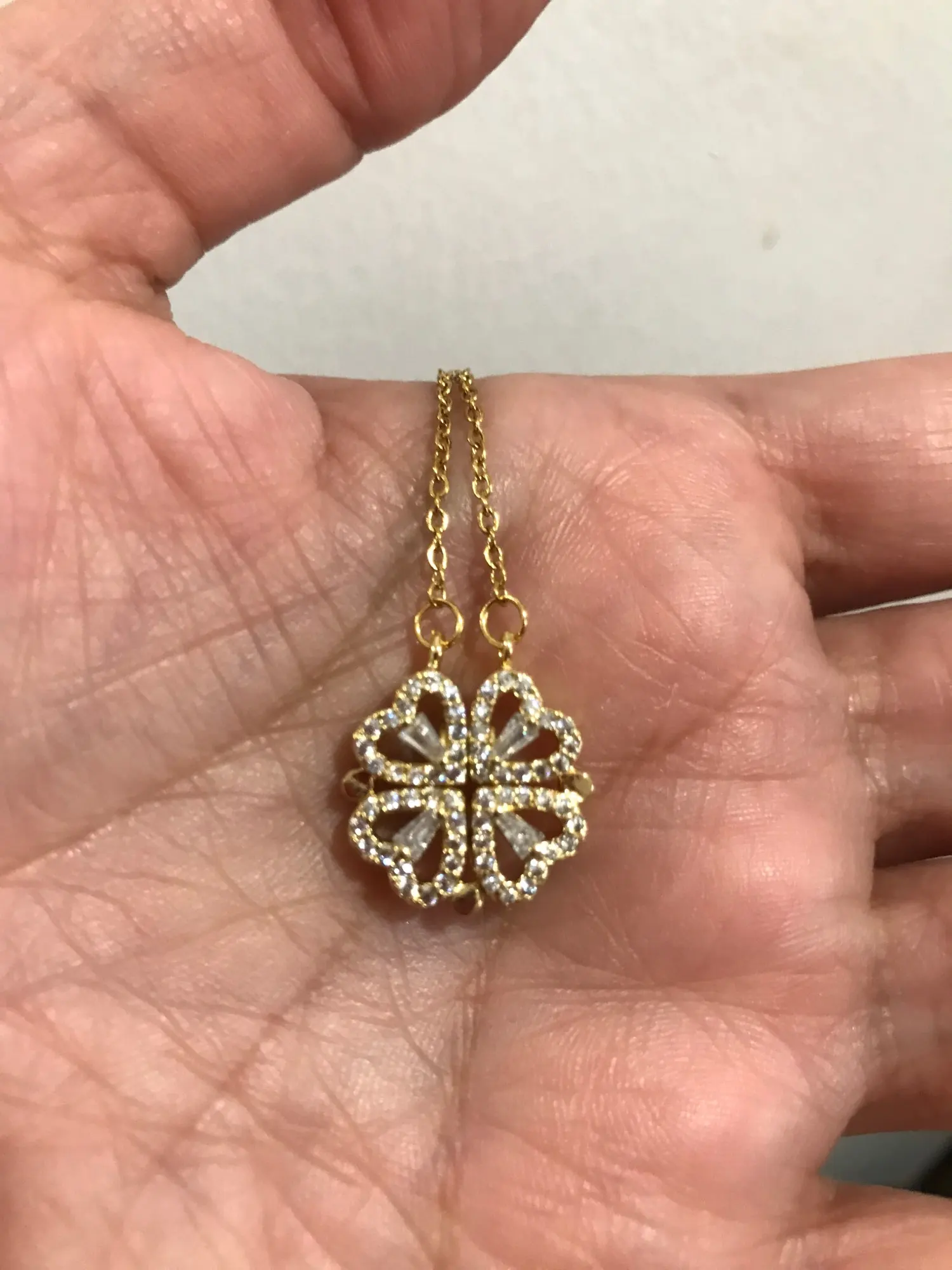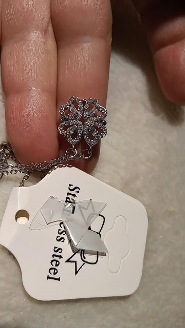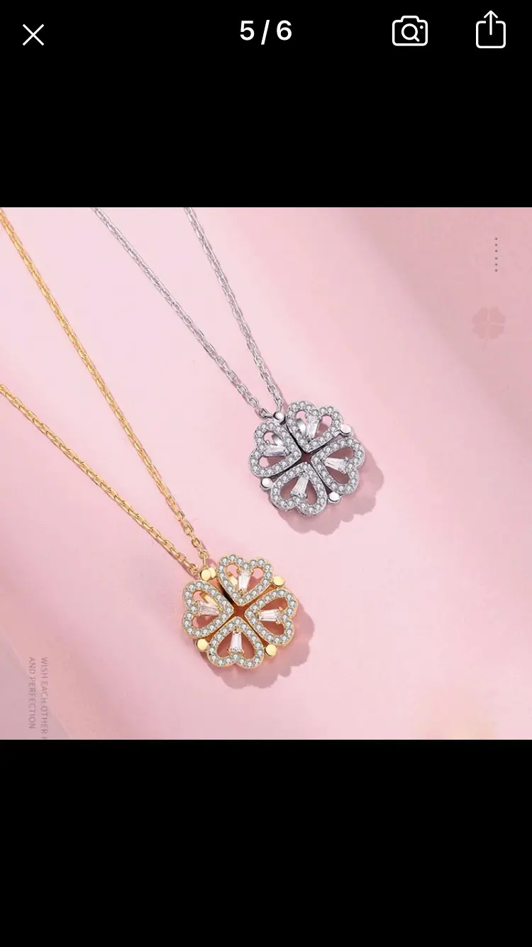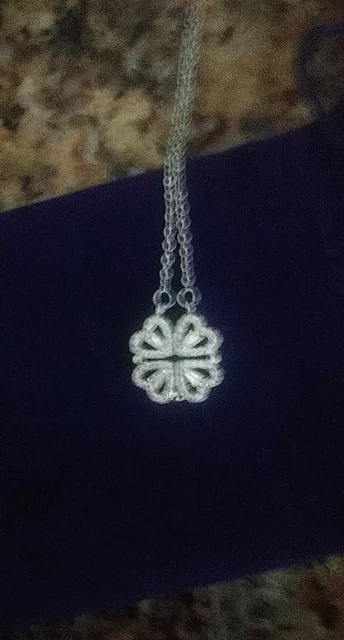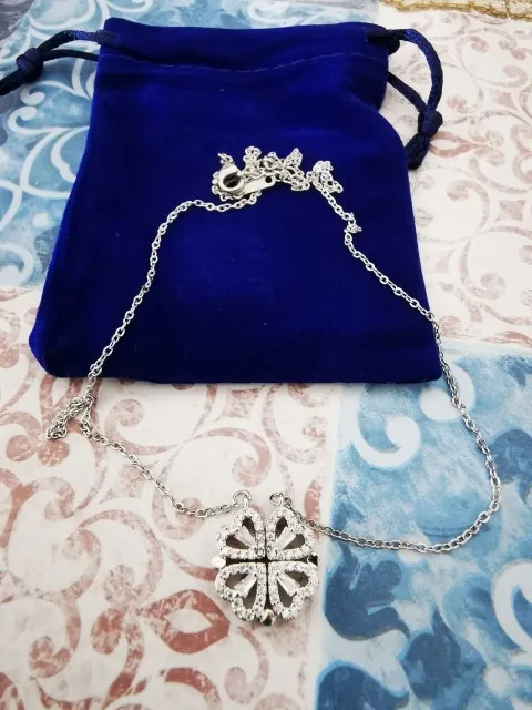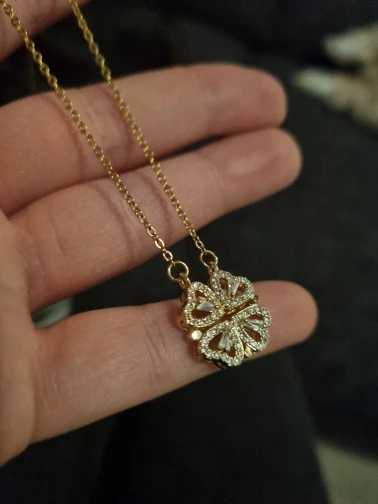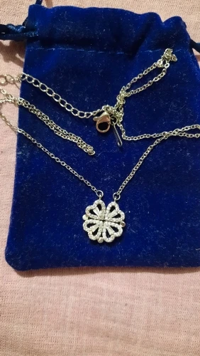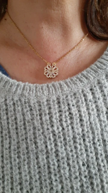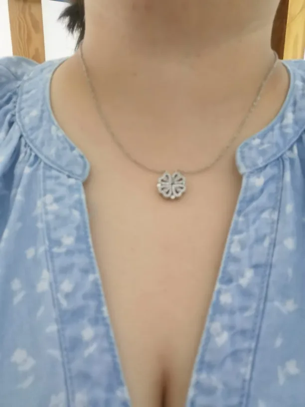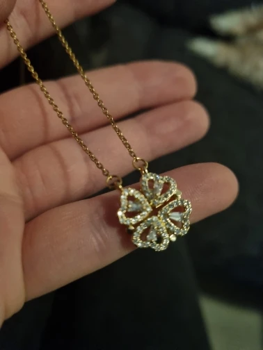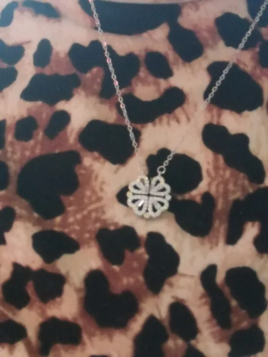 Он выглядит мило, и я думал, что он был идеальным, пока не понял, что должен быть небольшой магнит, соединяющий сердца, но включает 2 кольца/петли, соединяющие ожерелье, поэтому, когда вы носите его, У вас может быть только Клевер или 4 сердца, и вам придется снять ожерелье и перевернуть ожерелье, но даже тогда, магнит довольно сильный, поэтому он возвращается к форме клевера. Не можете открыть ожерелье и носить Оба изделия. Если вы не возражаете, то это довольно хорошо. Цепочка немного длинная, поэтому ожерелье сидит довольно низко
