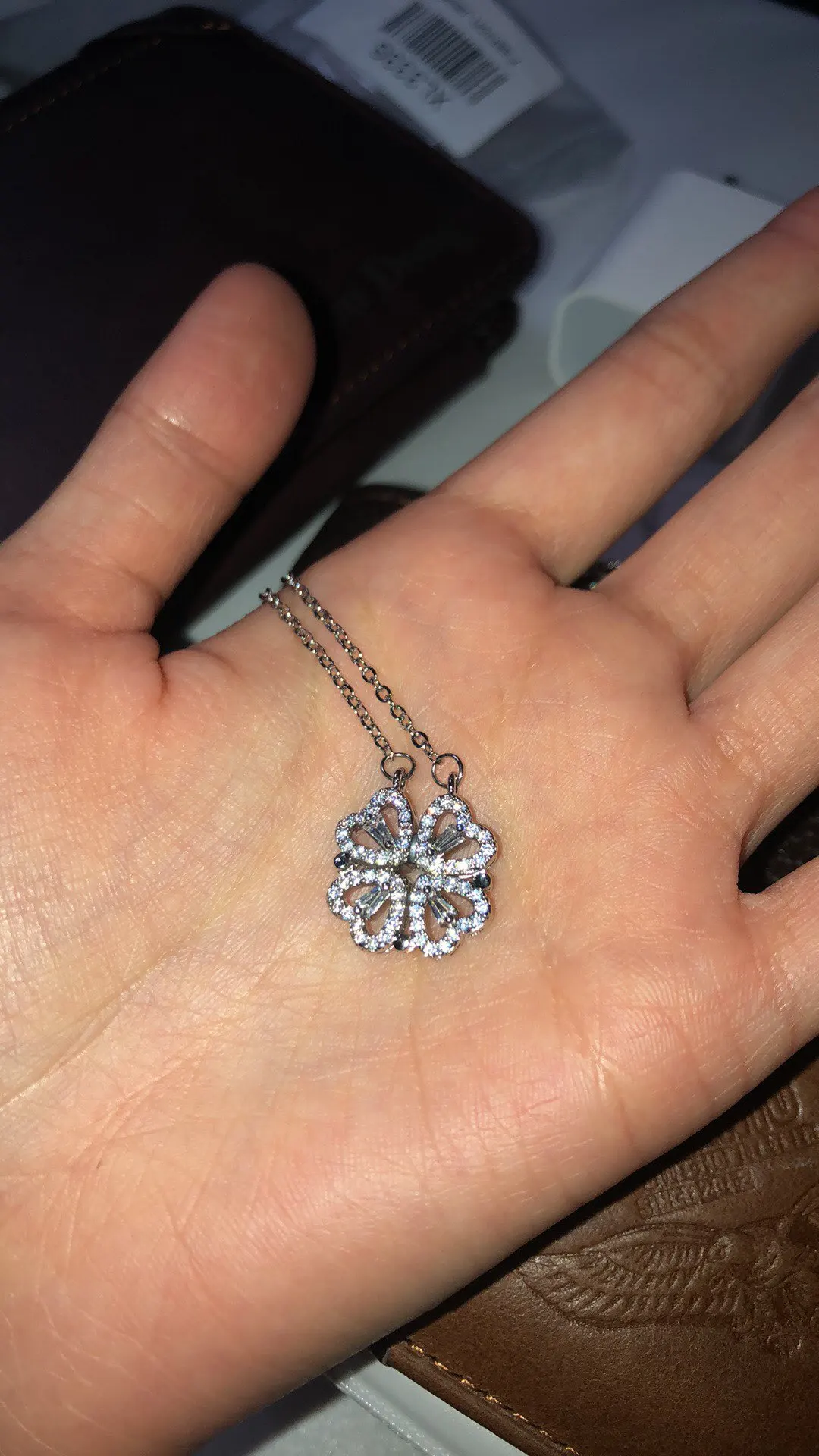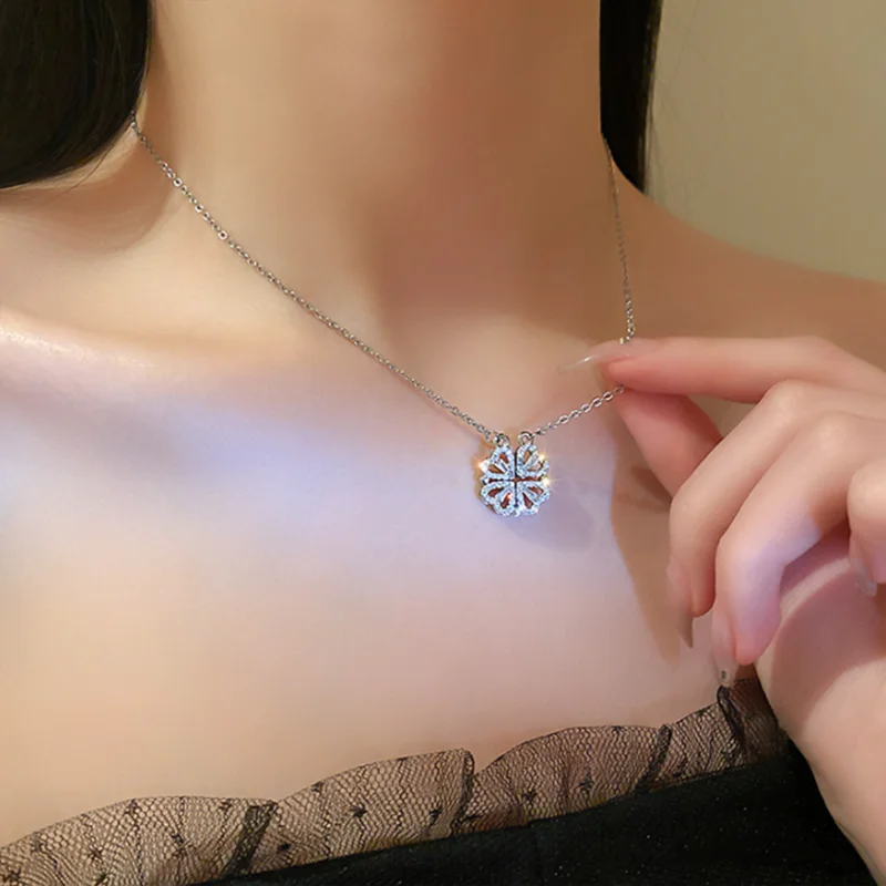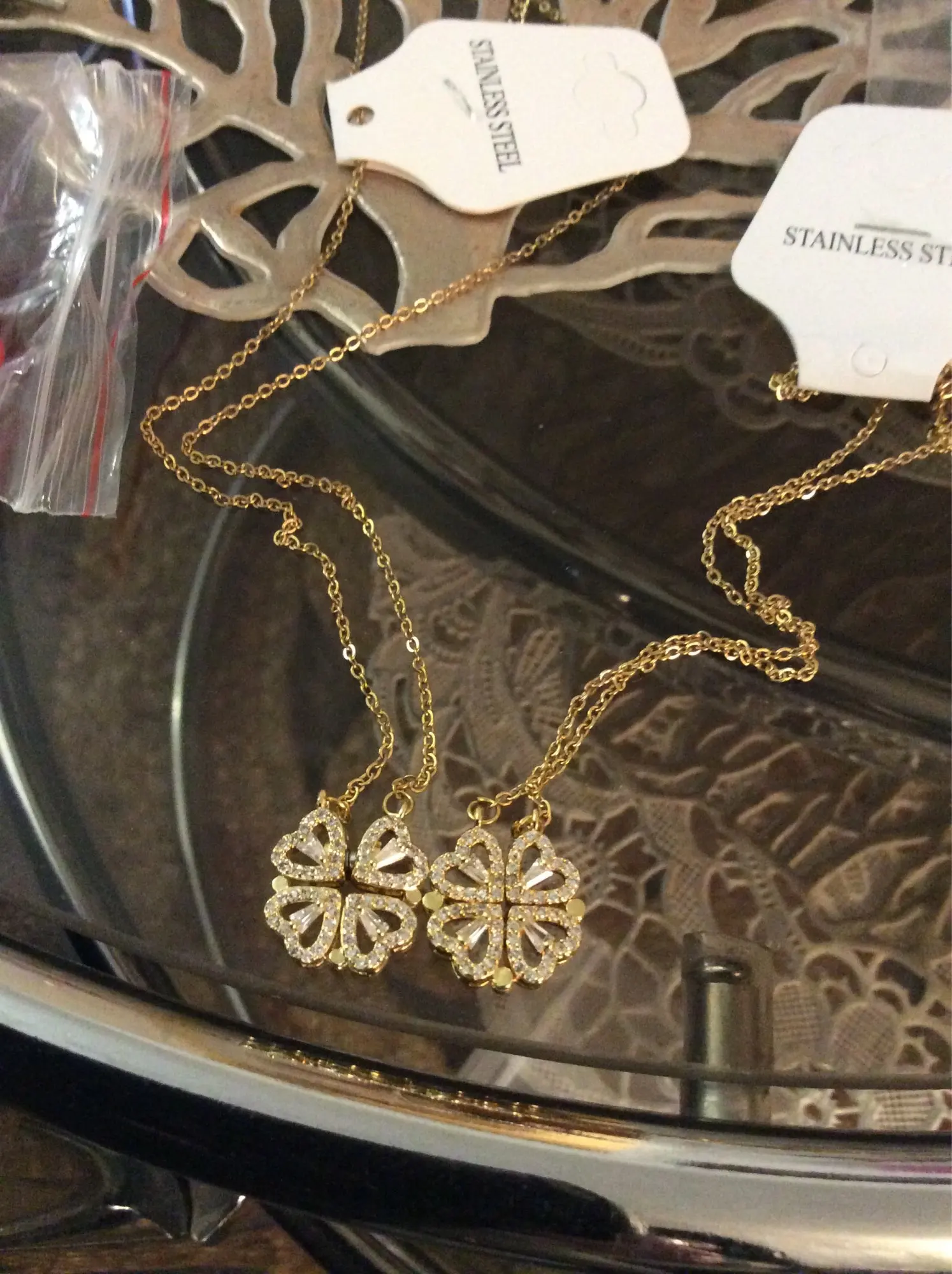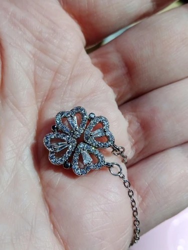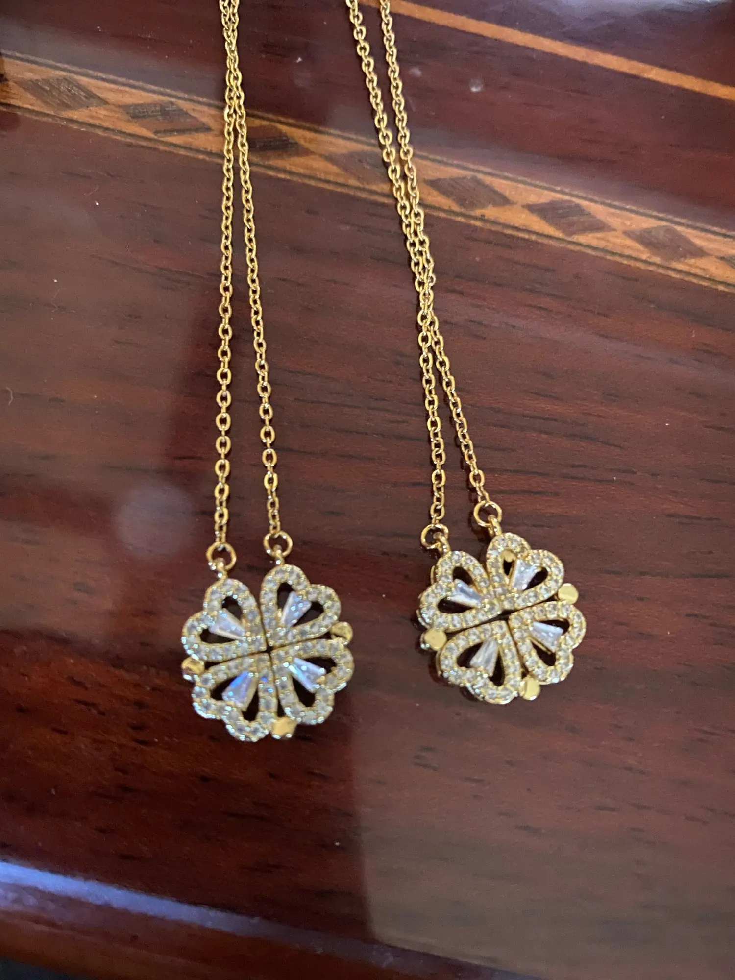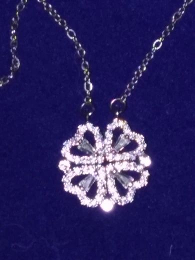 Он выглядит мило, и я думал, что он был идеальным, пока не понял, что должен быть небольшой магнит, соединяющий сердца, но включает 2 кольца/петли, соединяющие ожерелье, поэтому, когда вы носите его, У вас может быть только Клевер или 4 сердца, и вам придется снять ожерелье и перевернуть ожерелье, но даже тогда, магнит довольно сильный, поэтому он возвращается к форме клевера. Не можете открыть ожерелье и носить Оба изделия. Если вы не возражаете, то это довольно хорошо. Цепочка немного длинная, поэтому ожерелье сидит довольно низко