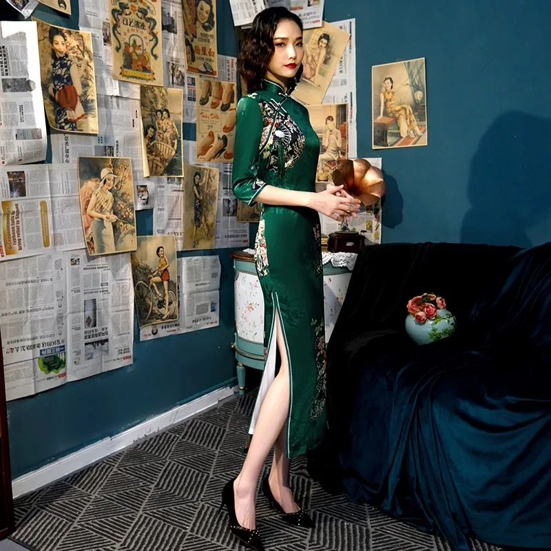 Зеленое традиционное китайское платье-Ципао с цветочной вышивкой, ш...