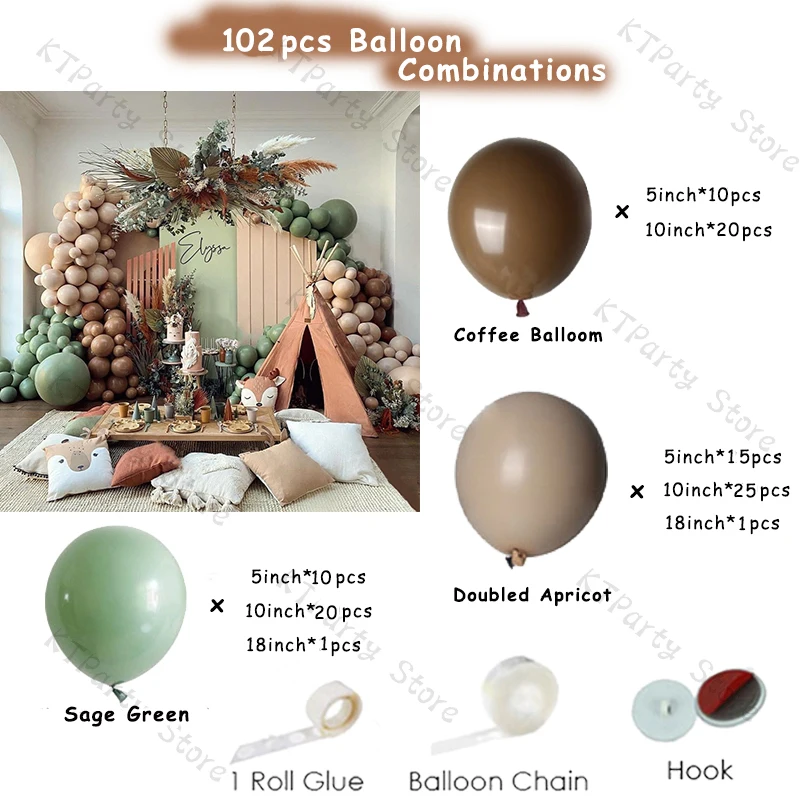 102 шт (10 футов) воздушный шар Упаковочный лист:Абрикосовый (5 дюймов * 15 шт., 10 дюймов * 25 шт., 18 дюймов * 1 шт.)Зеленый Шалфей (5 дюймов * 10 шт., 10 дюймов * 20 шт., 18 дюймов * 1 шт.)Кофейный шар (5 дюймов * 10 шт., 10 дюймов * 20 шт.)Бесплатно: рулонный клей * 1(100 шт)Воздушная цепь * 1(5 м)Крючок * 3