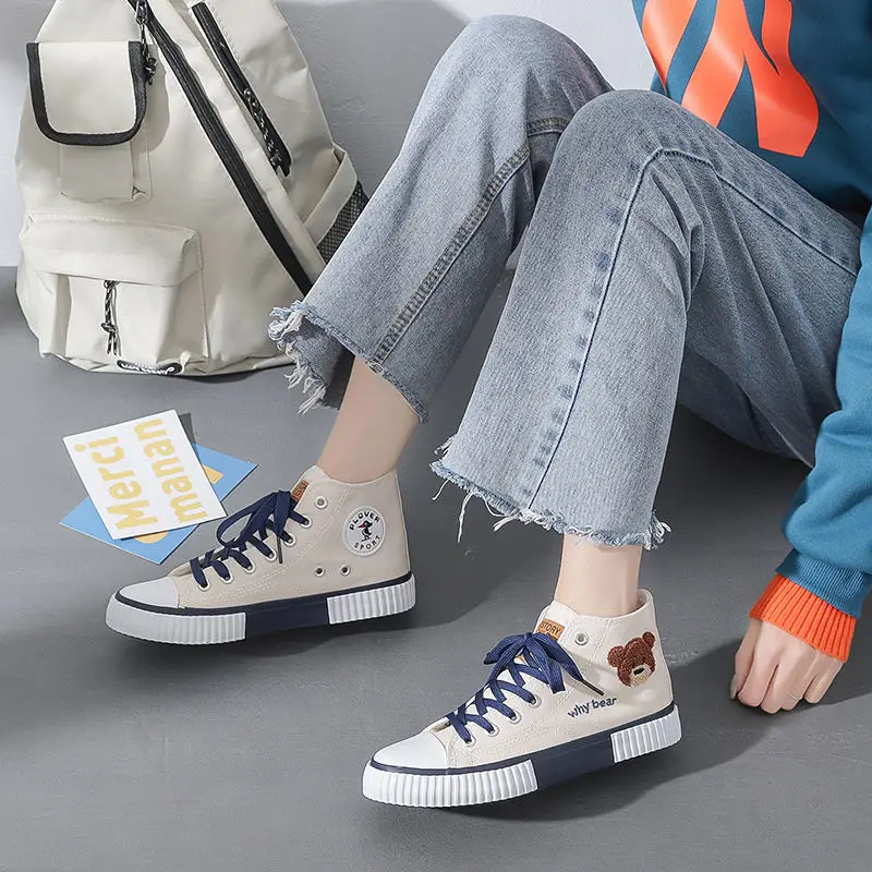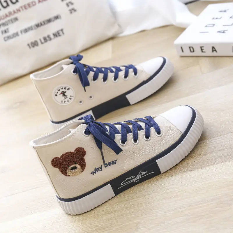 Женские холщовые кроссовки QWEEK на высокой платформе, Вулканизированная подошва, спортивная обувь в Корейском стиле, белые, с рисунком медведя, на весну