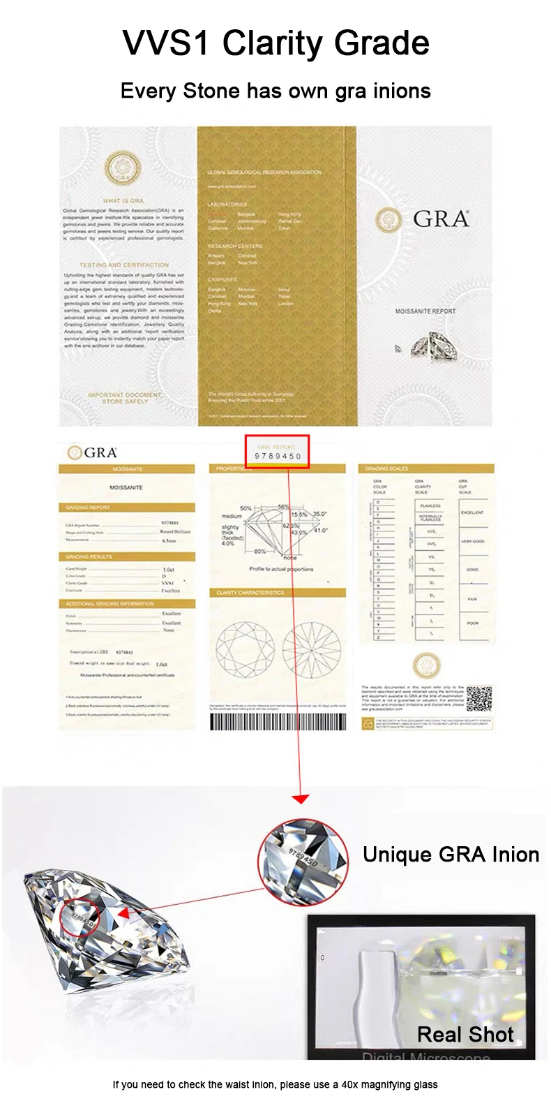 Zackiii jewelry-это завод с производственным цехом площадью 2000 квадратных метров, способный от исследований и разработок до производства. Качество нашего Moissanite сертифицировано GRA international. Каждый моиссанит имеет уникальный лазерный гравированный GRA сертификат номер. Мы отправим сертификат gra и черную карту гостю с посылкой. Гости могут проверить номер сертификата Moissanite с увеличительным стеклом 40 x. Наш Moissanite обладает тремя качествами: FL (клеш), if (внутренняя вспышка) и vvs1. Пожалуйста, покупайте в соответствии с вашими потребностями.