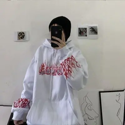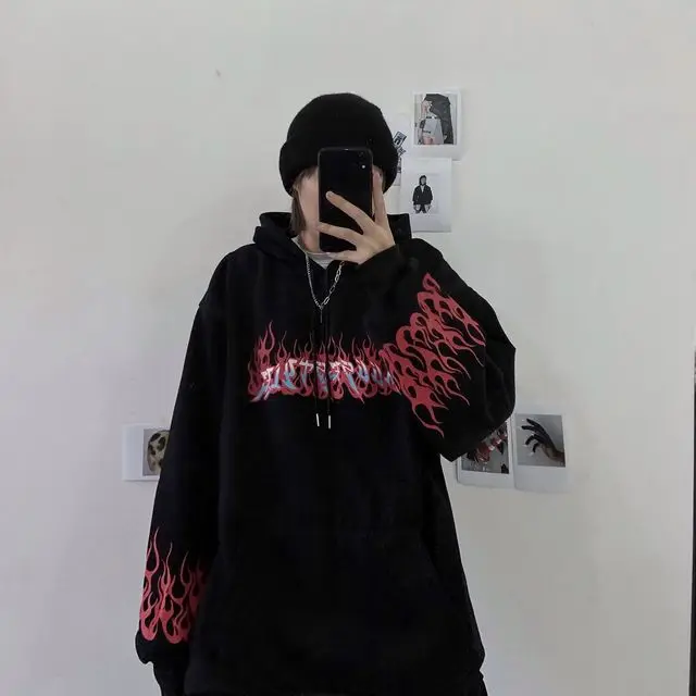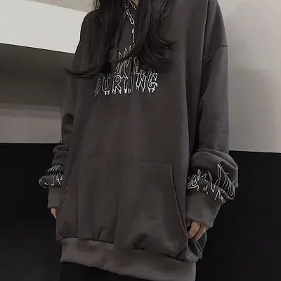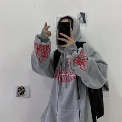 Женский свитшот с принтом пламени, в готическом стиле, большого размера, Осенний пуловер с длинным рукавом, в Корейском стиле