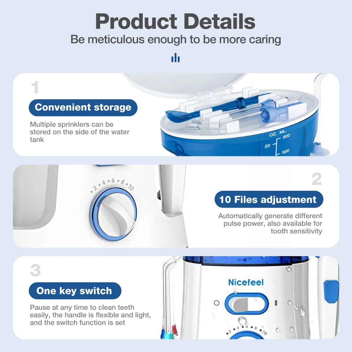 Электрические красные зубы, красные зубы, бытовые шайбы с зубчиками, зубная нить, очиститель зубов, Рабочий столОписание:1. Легко и эффективно:Наш водный поплавок-это простой и наиболее эффективный способ поплавки, удаляющий до99,9 процентовОНалетИз обработанных районов и на 50 процентов эффективнее, чем нить для улучшения здоровья десен. Идеально подходит для брекетов, имплантатов и других стоматологических работ.2. Передовые технологии:Особенности режима массажа для стимуляции десен, плюс повышенное давление с 10 настройками, в зависимости отОт 10 до 100 фунтов на квадратный дюймДля таможенной очистки. Интегрированный в таймер/pacer ненадолго останавливается на 30 сек и 1 мин, чтобы помочь отслеживать непрерывное время. Обеспечивает 1400 импульсов воды в минуту.3. Резервуар большого объема и управление потоком:Вмещает 22 унции и обеспечивает90 секундЕмкость воды: не требуется перезаправка. Резервуар-это верхняя стойка для посудомоечной машины, безопасная для легкой очистки. Легко контролировать поток воды с удобным переключателем вкл/выкл ручек.4. 7 подсказок для нескольких членов семьи: 3 классических, 1 ортодонтического, 1 зубного налета для имплантатов и других стоматологических работ, 1 карман для пародонта, 1 наконечник зубной щетки. Советы вращаются на 360 градусов для легкого доступа кВсе областиРот.Характеристики продукта:Мощность Источник: AC100-240V В переменного тока, 50/60 ГцКоличество импульсов: 1250-1700 раз/минРегулируемое давление: 10-этап механизм регулировки давленияЕмкость резервуара для воды: 600 млДиапазон давления: 30-125psiВес нетто продукта: 0,77 кгНоминальная мощность: 18 ВтРазмер изделия: 209x125x220ммПосылка:1 x Основная машина Nicefeel1 резервуар для воды1 х крышка резервуара с наконечниками для хранения7 наконечников (3 классических наконечника струи, 1 наконечник искателя налета, 1 ортодонтический наконечник, 1 Карманный наконечник Pik, 1 Очиститель языка)1 x ручка1 х руководство на английском языке