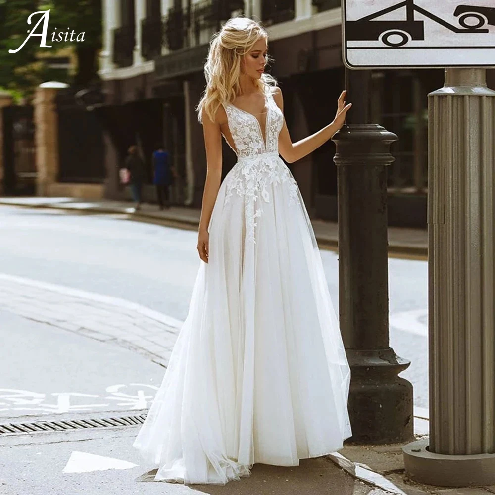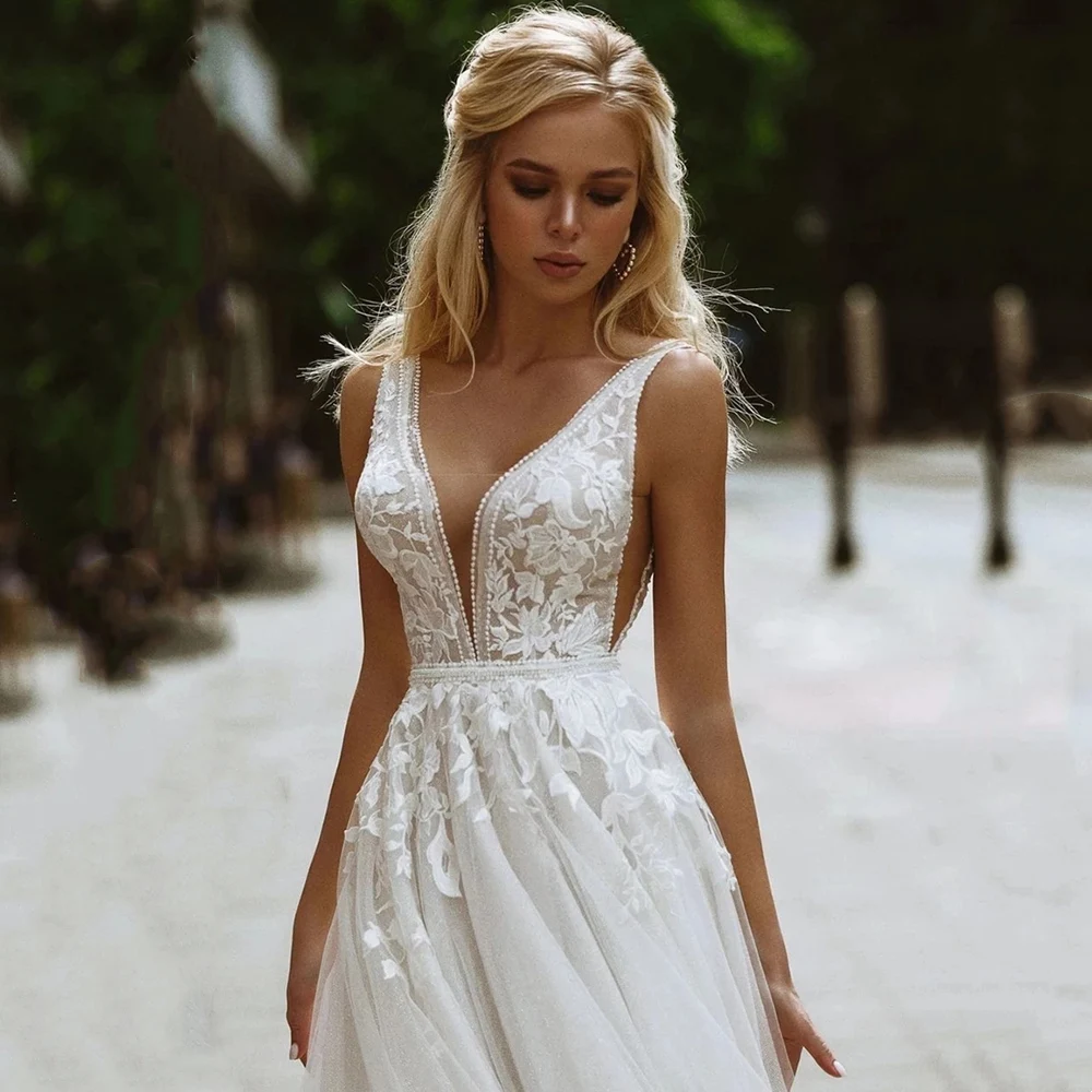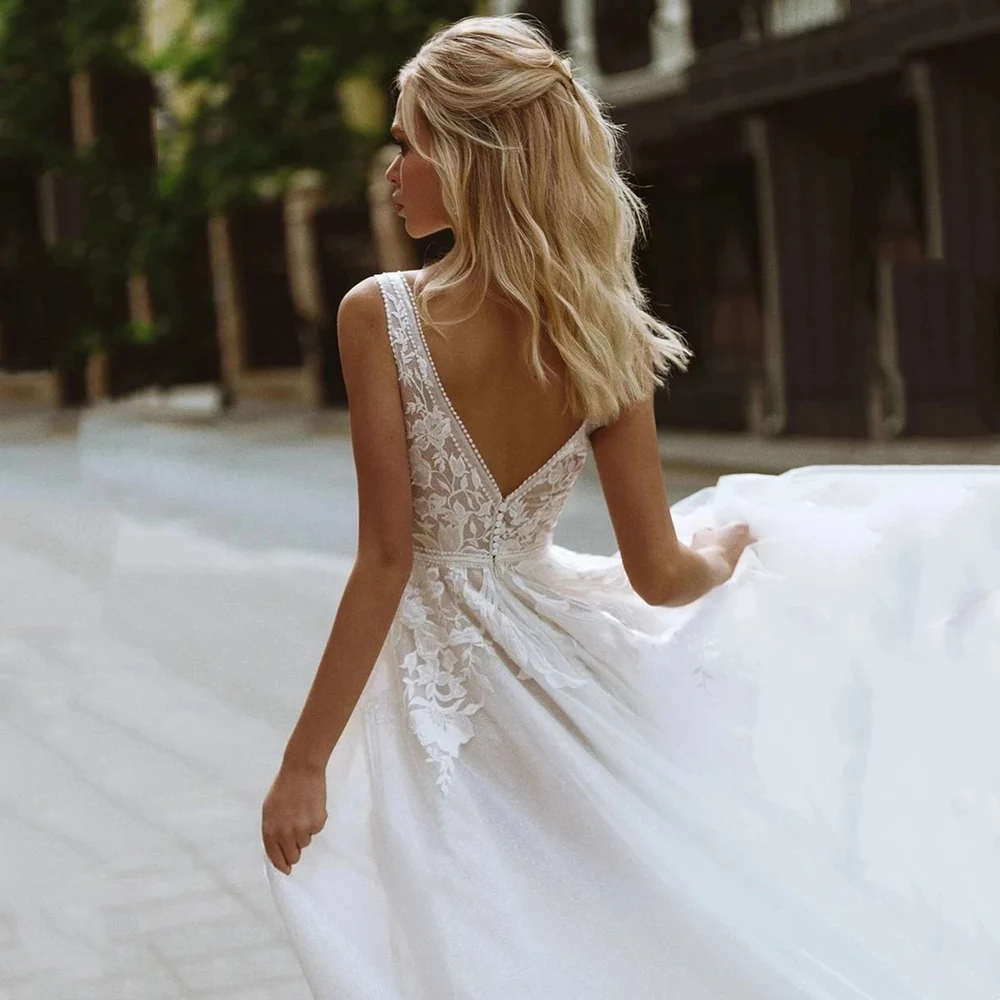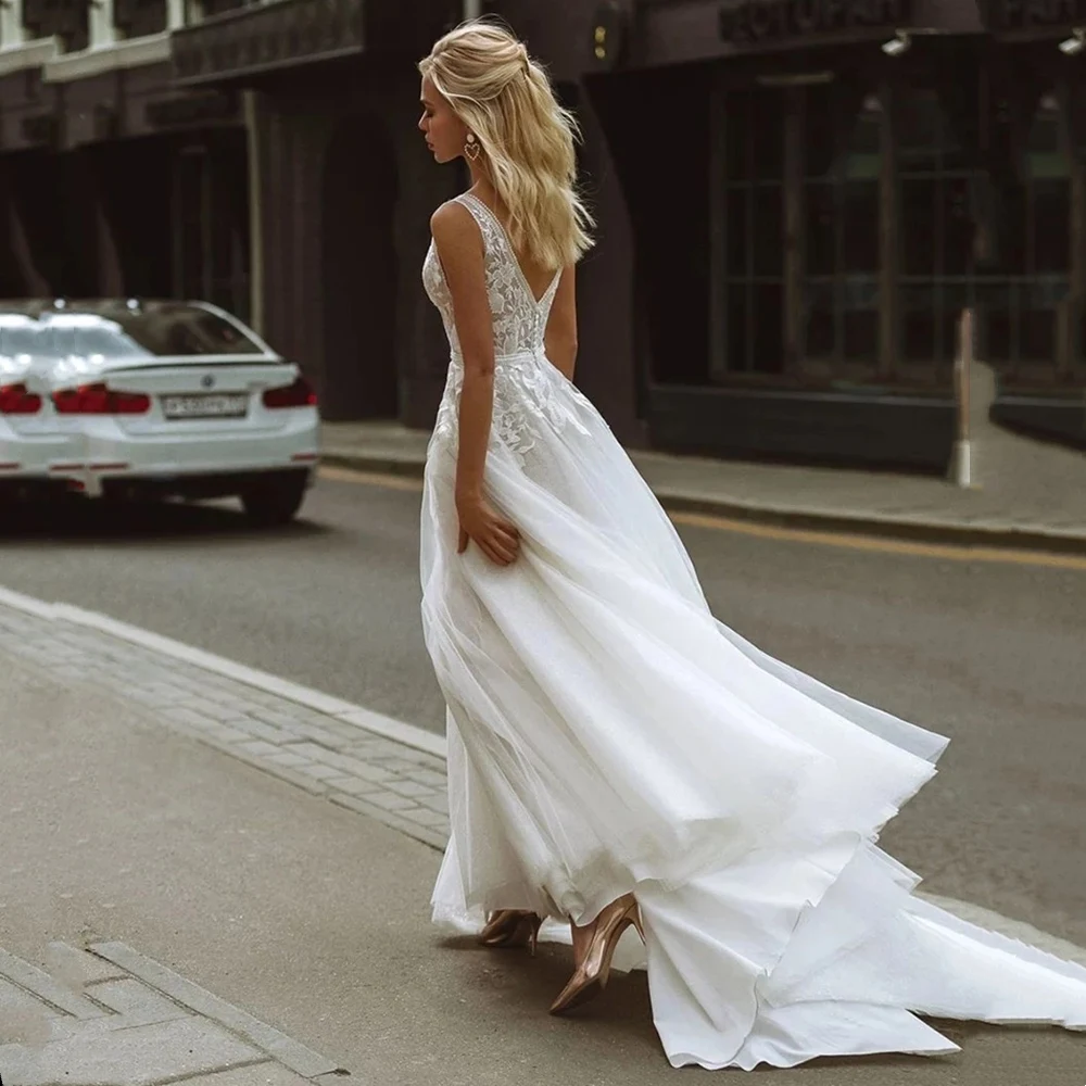 Женское свадебное платье без рукавов, простое платье с V-образным вырезом, открытой спиной и кружевной аппликацией, ТРАПЕЦИЕВИДНОЕ платье невесты