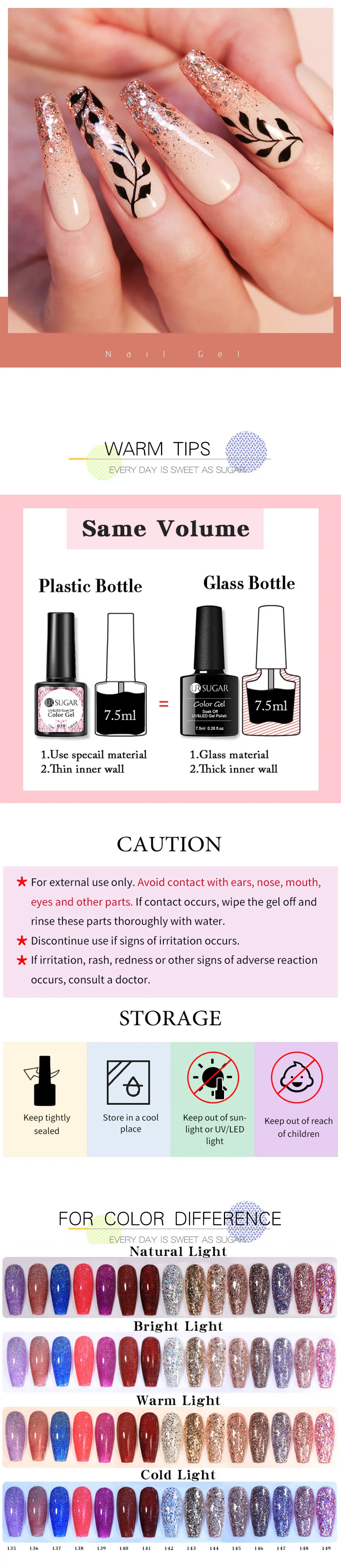 Примечание:Матовый эффект должен быть нанесен матовым верхним слоем, чтобы получить эффект изображения. Цвет может немного отличаться из-за разного разрешения на каждом компьютере и мобильный телефон. Если у вас возникли проблемы, пожалуйста, свяжитесь с нами, мы разберемся с ними для вас. Спецификация:Бренд: UR SUGARФирменный Слоган: каждый день сладкий, как сахарТип: Гель-лакКоличество: 1 бутылкаОбъем: прибл. 7,5 млИнгредиент: смолаДлительный период: около 15 дней или болееЭффект: блестящийСертификация: SGS, MSDS, REACH, CPNPИнструменты для отверждения: УФ-лампа или светодиодный светильник Посылка:1 бутылка 7,5 мл UR SUGAR; Однотонная; Украшенная пайетками; Цвет замочить OffGel лак для ногтей Уникальное предложение:Он изготовлен из здоровых, экологически чистых, не ядовитых, резких химических материалов.Он быстро сохнет с любым УФ-светильник.Длительный срок службы не менее 2-3 недель, фантастические и супер яркие ногти для вас.Этот Гель-лак для ногтей легко наносится и впитывается.Позвольте вам профессиональный или домашний дизайн ногтей.Профессиональный подарок для ногтей для себя или вашей подруги. Профессиональное использование:Шаг 1. Очистите ногти, затем закрепите поверхность ногтей как обычный ноготь.Шаг 2. Полностью встряхните лак, он может сделать польский цвет сбалансированным. (ВАЖНО)Шаг 3. Сначала нанесите базовый гель, который может сделать лак длительным, вылечите УФ-гелевой лампой или светодиодный светильник для ногтей. (Необходимо)Шаг 4. Нанесите первый слой цветного УФ-геля непосредственно, закрепите УФ-лампой в течение 2 минут или вылечите светодиодный светильник в течение 60 секунд.Шаг 5. Нанесите второй слой цветного геля, а затем немедленно закрепите УФ-лампой в течение 2 минут или вылечите светодиодный светильник в течение 60 секунд.Шаг 6. Покрытие без протирания, излечивается УФ-лампой или светодиодный лампой. Удалите наш УФ-гель для ногтей шаг:• Замочите ногти в миске, заполненной небольшим количеством ацетона, или оберните каждый ноготь в ватную подкладку, смоченную ацетоном, примерно на 5-10 минут.• Продукт начнет становиться мягким, и вы можете аккуратно отпилить его или сдвинуть с помощью небольшой деревянной палочки. Теплое напоминание:1. Избегайте контакта с кожей. Если возникают покраснения или другие признаки нежелательной реакции, немедленно прекратите использование.2. Плотно закрываются. Держите подальше от солнечного света. Хранить в недоступном для детей месте. Примечание:Пожалуйста, избегайте контакта с кожей. В чехол несчастных случаев или в том случае, если вы чувствуете себя плохо, немедленно обратитесь к врачу (показать на этикетке в тех случаях, когда это возможно)