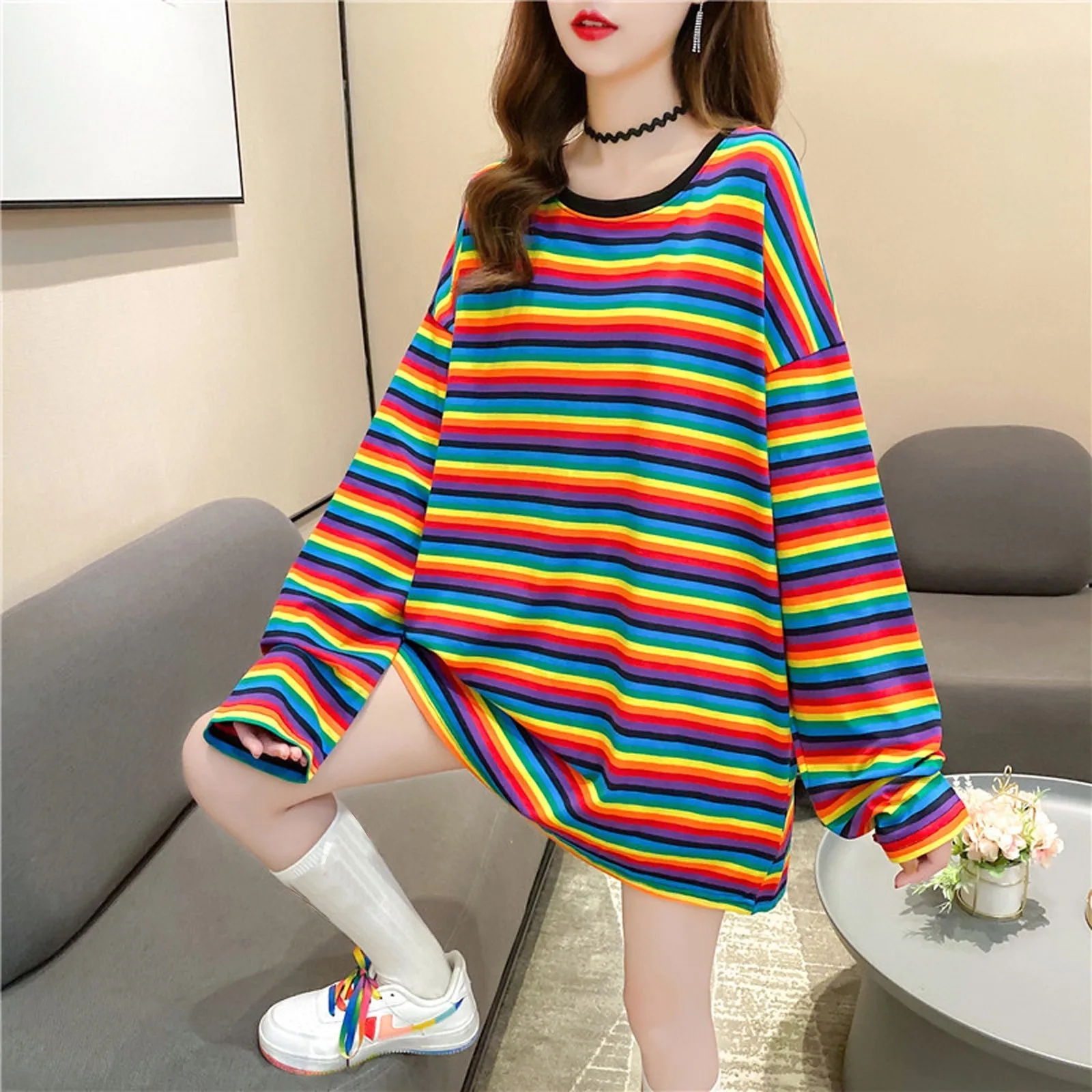 Женская Свободная блузка в стиле Харадзюку, футболка в радужную полоску контрастных цветов, Топ с длинным рукавом, уличная одежда, футболка, женская одежда 2021