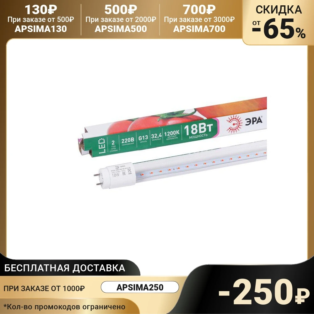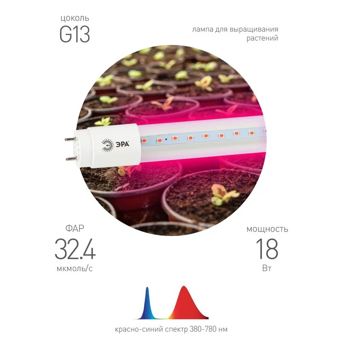 Лампа для растений, сине-красный спектр, 18 Вт, Т8 1200 мм, 32,4 мкмоль/с, цоколь G13, «ЭРА»