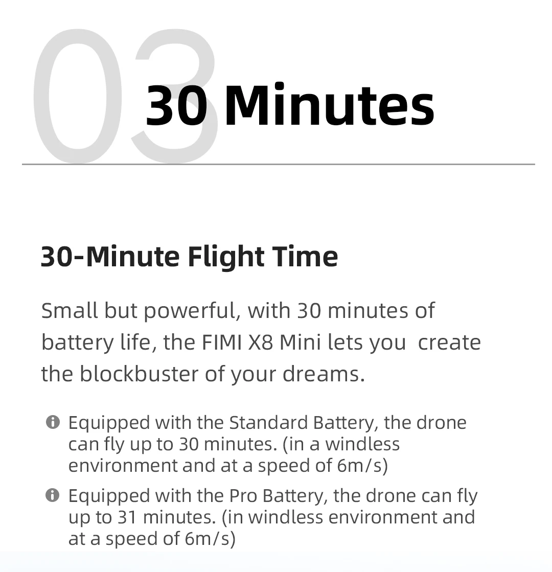 Основные характеристики:Сверхлегкий дизайн класса 1,250g: благодаря ультралегкому и складному дизайну класса 250g-класс, размер ладони FIMI X8 Mini позволяет вам свободно летать, где бы вы ни находились. Используйте несколько режимов съемки, чтобы запечатлеть уникальные моменты с неба!2. Выбор между двумя батареями: вес дрона со стандартным аккумулятором составляет около 258 г; Вес дрона с про батареей составляет около 245 г3. Дальность передачи 8 км: обновленная система передачи изображений TDMA обеспечивает стабильную передачу и оптимизированную чувствительность. С дальностью передачи 8 км, пейзаж всегда с вами. Чем дальше вы можете летать, тем дальше вы можете видеть.4. 30-минутное Время полета: маленький, но мощный, с 30 минутами автономной работы, FIMI X8 Mini позволяет создать блокбастер вашей мечты.* Оснащен стандартным аккумулятором, Дрон может лететь до 30 минут. (В безветренной среде и со скоростью 6 м/с)* Оснащен аккумулятором Pro, Дрон может лететь до 31 минуты. (В безветренной среде и со скоростью 6 м/с)5. Быстрая зарядка аккумулятора типа C: зарядный порт типа C на аккумуляторе обеспечивает быструю зарядку 9 В/3 А. Заряжайте резервные батареи без хлопот во время полета дрона.6. Стабилизированный 3-осевой механической Gimbal: FIMI X8 Мини сочетает в себе легкий 3-осевой механической gimbal с самыми последнимиПрофессиональный алгоритм управления для гораздо лучшей точности 0,005 °. Отличная производительность означает стабильную запись!6. 4K HDR видео: камера имеет 4K/30 кадров в секунду видео и очень динамический диапазон, что означает более четкие кадры. Видео снимаются в кодеке H.265/HEVC, поддерживаются формат F-log и DNG. Наслаждайтесь профессиональным визуальным опытом, независимо от того, отправляете ли вы видео другу или редактируете свой следующий блокбастер.7. Прямой полет с помощью смартфона: Дрон может подключаться к вашему мобильный телефон через Wi-Fi даже без пульта дистанционного управления. С высокой пропускной способностью низкой задержкой, и сильный анти-помех 5,8 ГГц высокочастотного сигнала создает до 100 м в режиме реального времени HD передача изображения. Быстро записывайте любой прекрасный момент, который вы не хотите пропустить.8. Уровень 5 сопротивление ветра: с небольшими магнитными зазорами и высокоэффективными бесшумными пропеллерами X8 Mini может противостоять ветру уровня 5, предлагаем лучшее соотношение тяги к весу и более высокую скорость отклика. Испытайте плавный полет независимо от того, находитесь ли вы на вершине ветреной горы или ходите по пляжу. Удобный пульт дистанционного управления-это светильник, который легко носить с собой. Модернизированный приемник позволяет вам наслаждаться стабильной передачей изображений.9. Умные режимы отслеживания: питание от технологии AI, Дрон всегда может точно зафиксировать на цели.10. Одно касание видео: с одним касанием, сделайте кинематографические снимки с FIMI X8 Mini.11. Мощная съемка плана полета: мощная функция съемки плана полета предназначена не только для планирования пути, но и для планирования задач.12. Timelapse: X8 Mini с профессиональной системой визуализации и управления полетом позволяет создавать высококачественные и стабильные видео с задержками времени.13. Livestreaming: Поделитесь живыми воздушными видео с друзьями через социальные платформы.14. Панорама: один кран создает Потрясающие панорамные фот