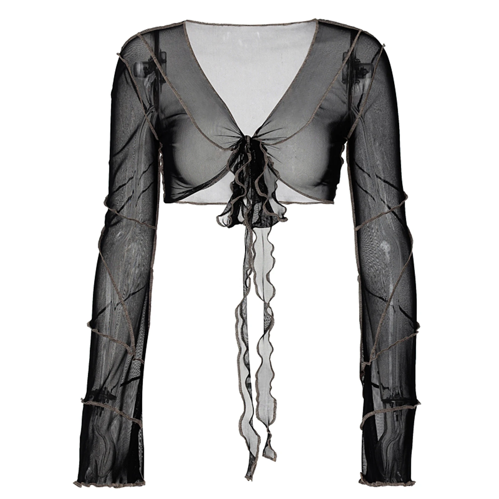 Женский укороченный топ на завязках, однотонная прозрачная сетчатая накидка с глубоким V-образным вырезом, длинным рукавом-колокольчиком и павлином, женская повседневная сексуальная рубашка, топы