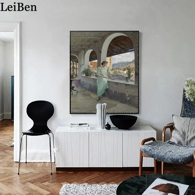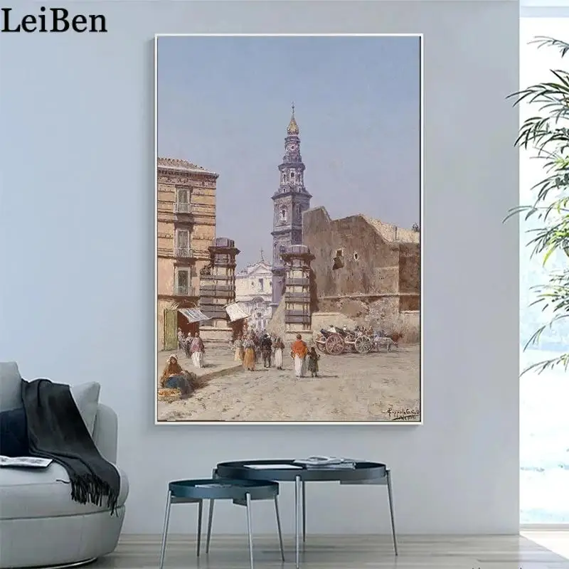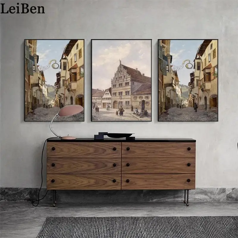 Картина маслом, европейский стиль принты с пейзажем, городская архитектура, плакат, маленький городок, площадь, уличный магазин, пейзаж, холст, Декор для дома и интерьера