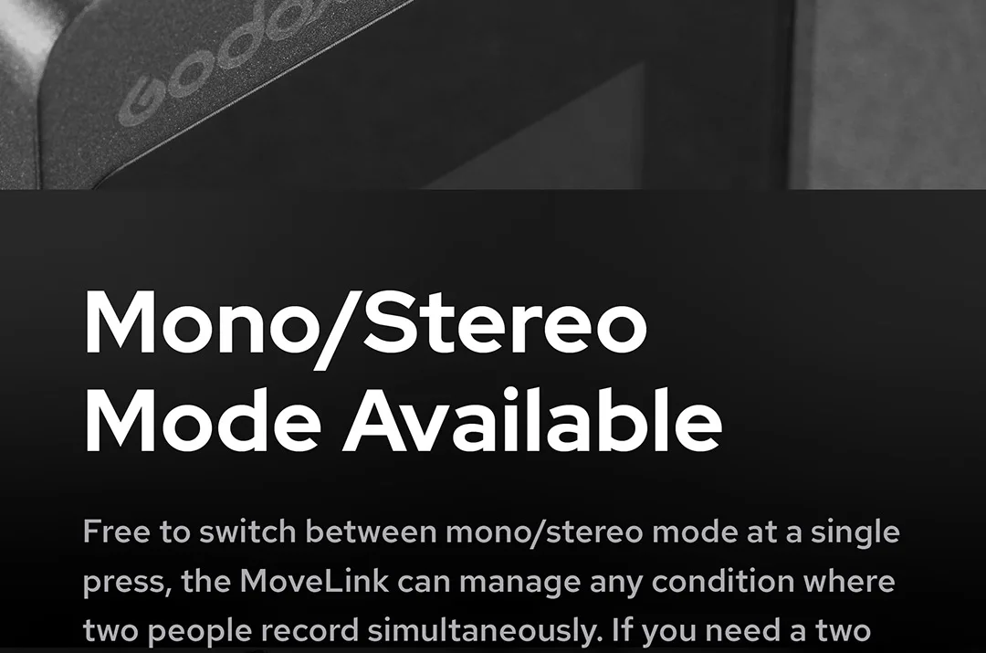 Свободно переключается между моно/стерео режимом, MoveLink может управлять любым состоянием, в котором два человека записывают одновременно. Если вам нужно решение с двумя звуковыми дорожками для постобработки каждого человека'Запись индивидуально, выберите режим стерео. В противном случае вы можете получить комбинированный звук от двух передатчиков в моно-режиме.