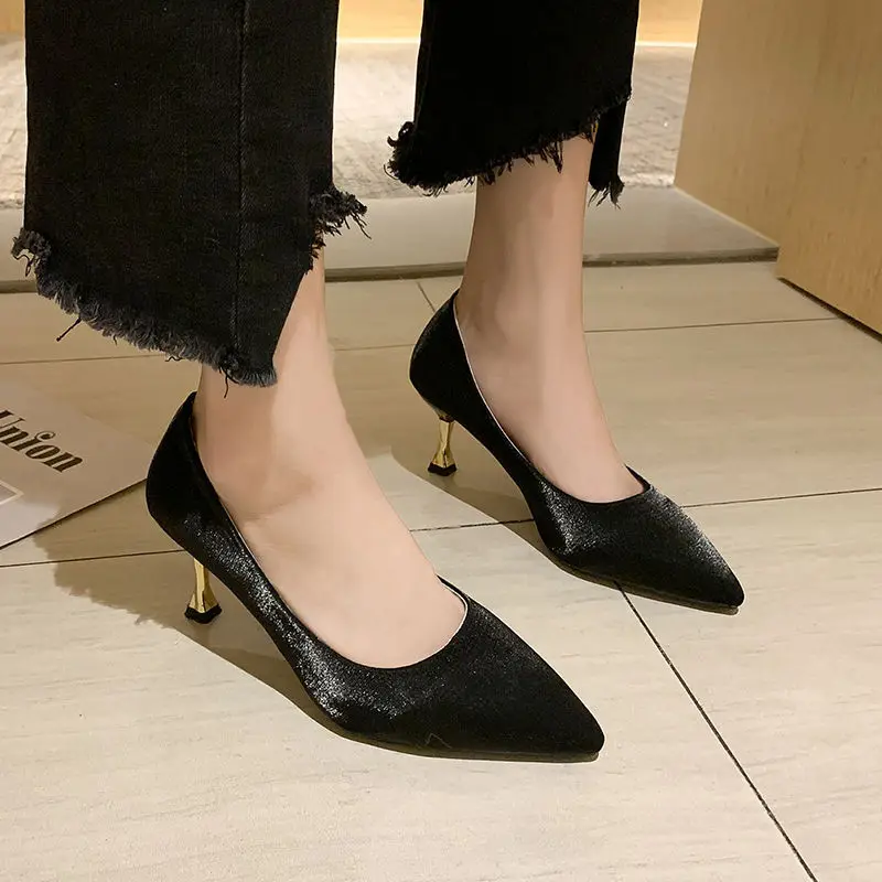 Весна 2021 Новинка корейский пикантный подходящий цвет металлический заостренный атласный высокий каблук Женский Тонкий Универсальный банкет