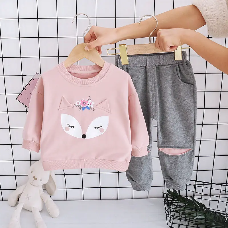 Свитшот и брюки для девочек, детские костюмы с милым рисунком лисы, хлопковые эластичные комплекты детской одежды с длинным рукавом