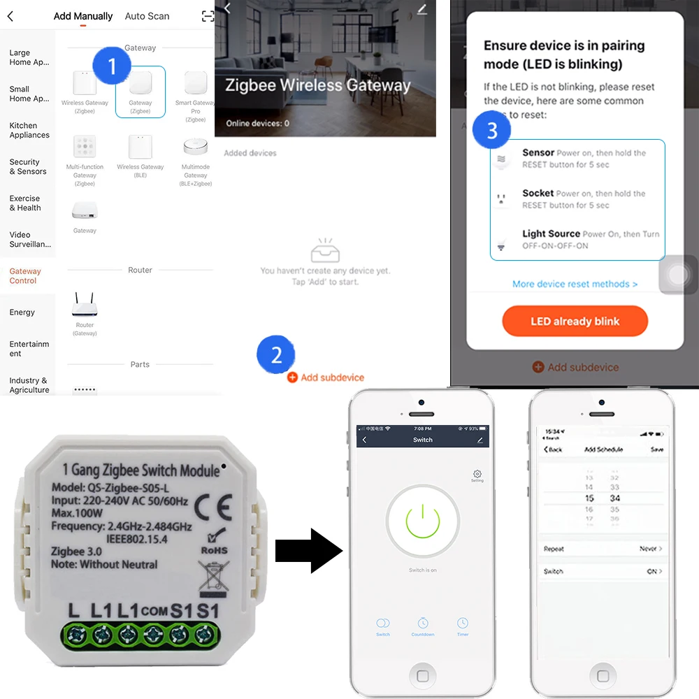 Как подключиться к телефону: И настройка в приложении, и переключатель могут перезаписывать друг друга, последняя Настройка остается в памяти. Управление приложением синхронизируется с ручным переключателем.1. Загрузите приложение tuya и Подключитесь к zigbee hub2. Пресс клавиша сброса на модуле около 10 секунд или включите включение/выключение выключателей в 5 раз, до тех пор, пока к данному товару светильник быстро мигает3. Выберите правильный продукт и завершите подключение Примечание: WiFi роутер, шлюз Zigbee, iPhone,iPad(IOS 7,0 или выше),Android 4,0 или выше