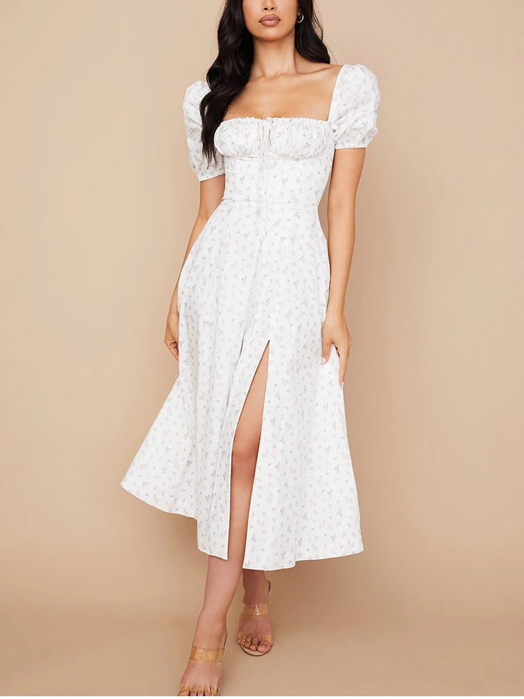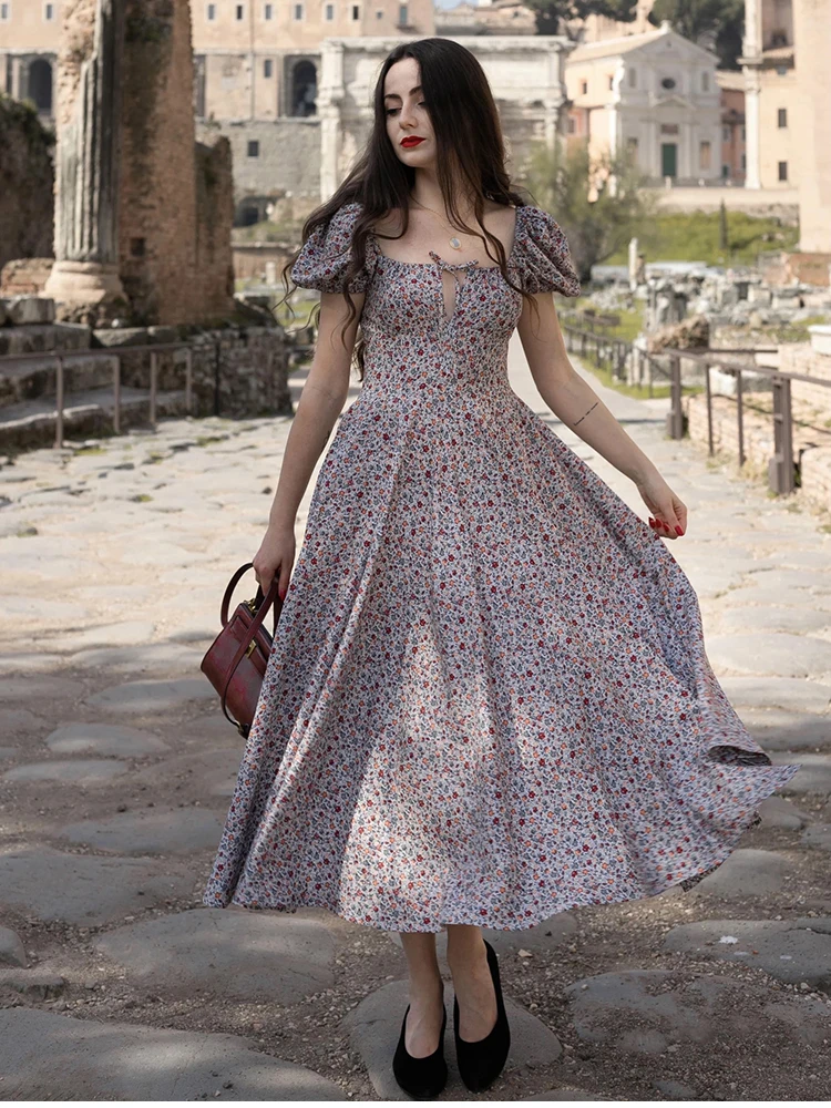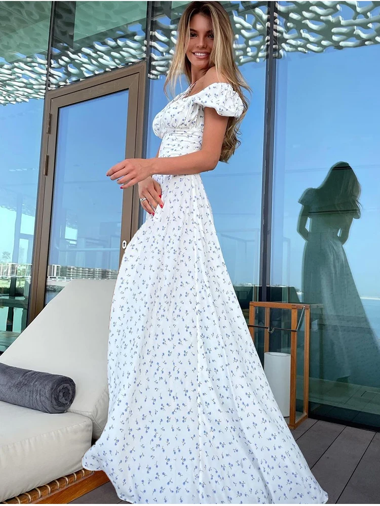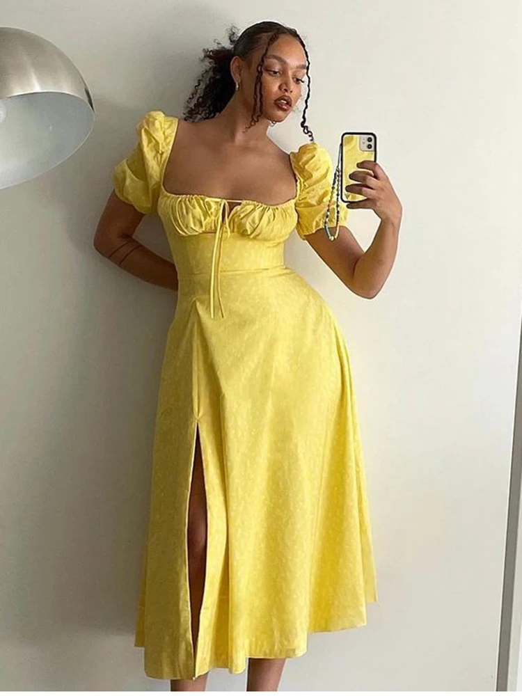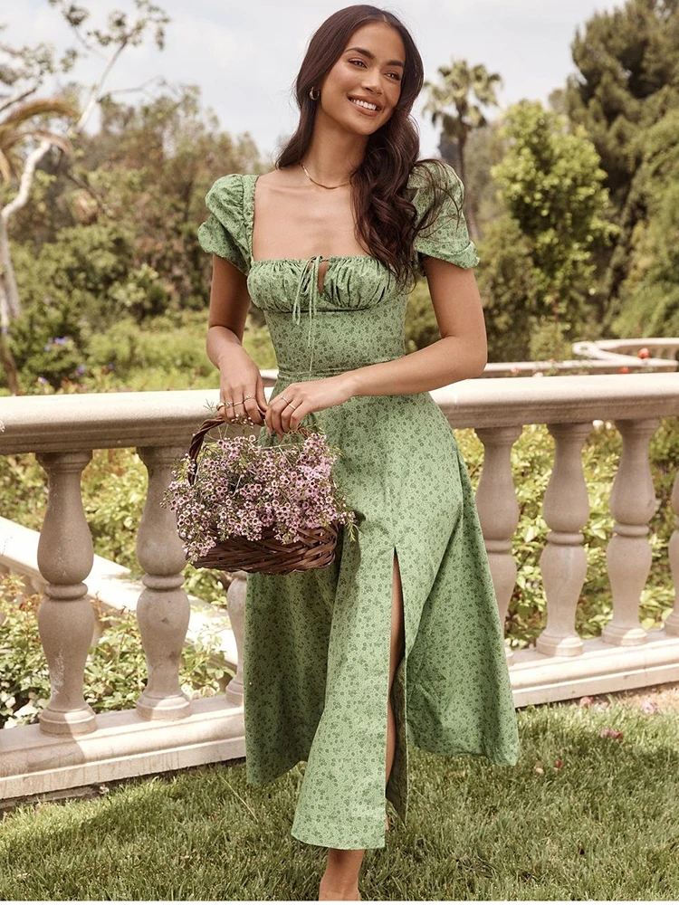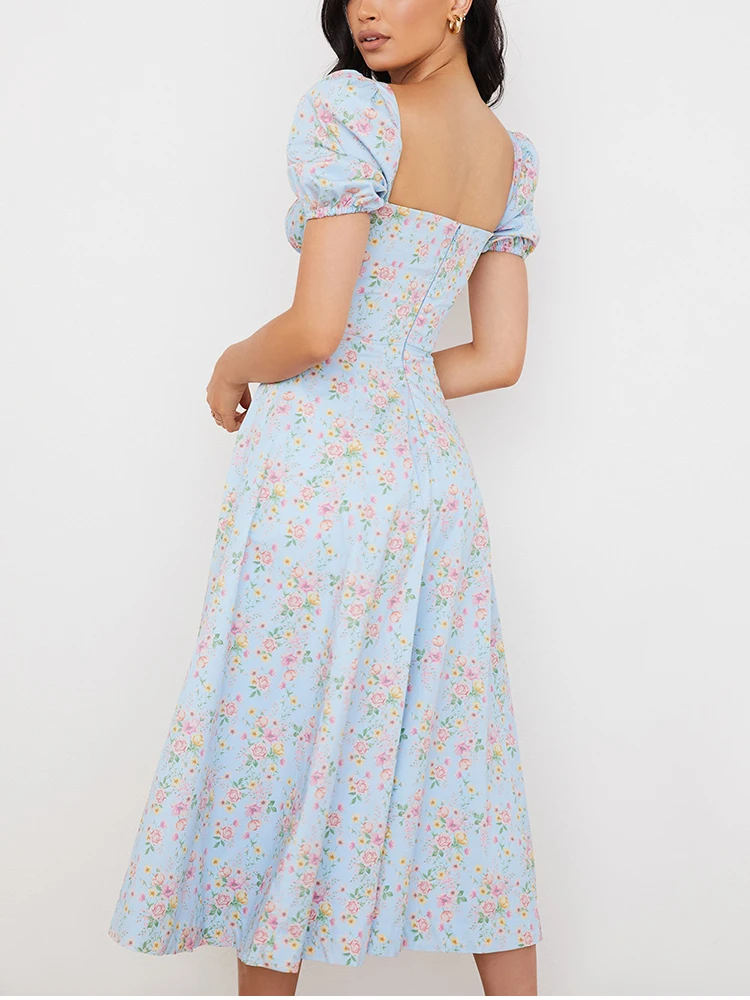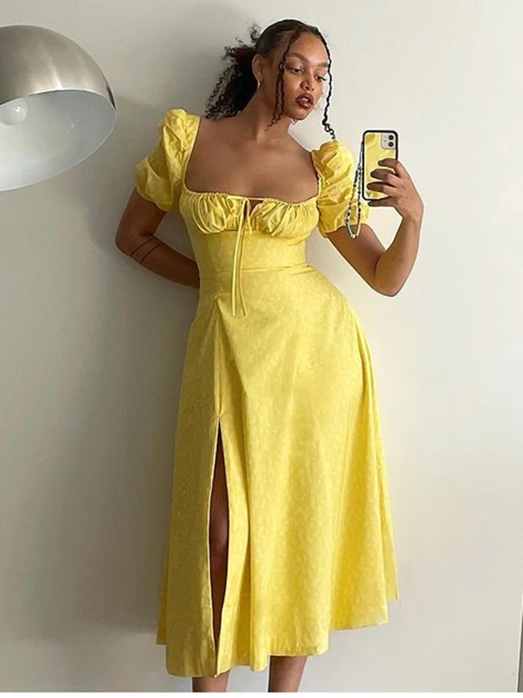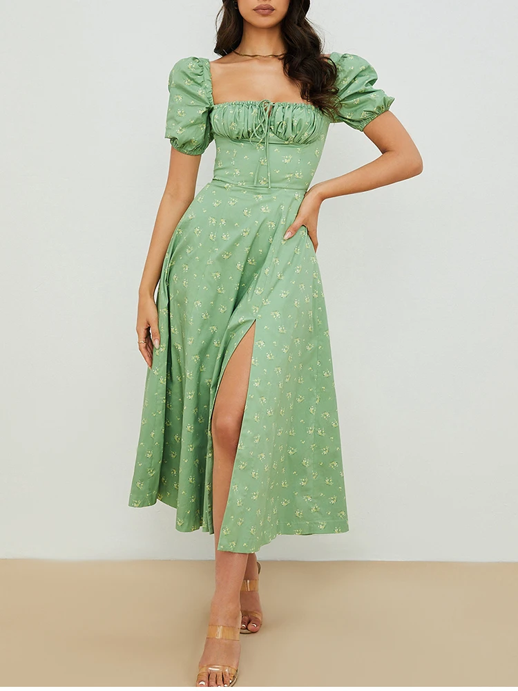 Женское платье с рукавами-фонариками NewAsia, длинное платье с цветочным принтом и разрезом сбоку, на молнии, с рюшами, милое летнее платье для женщин, 2021