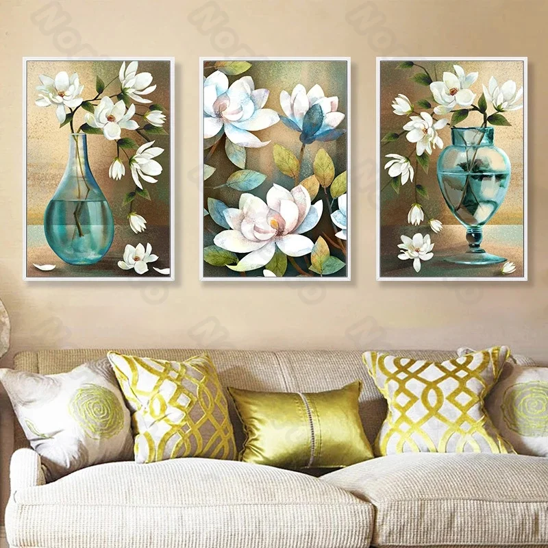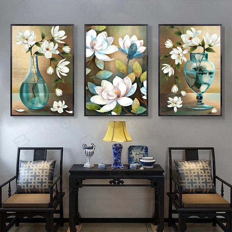 Холст в современном стиле, винтажная зеленая ваза, абстрактное искусство, белые цветы для дома, галерея, настенное украшение