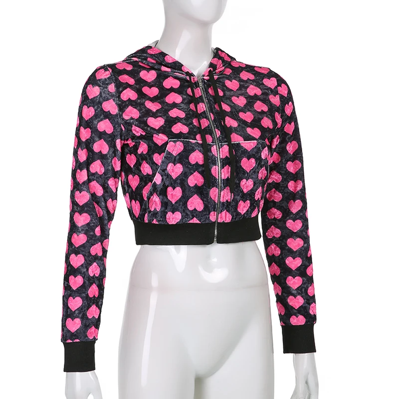 Вельветовые куртки с капюшоном, женские толстовки на молнии с принтом сердца, кавайная укороченная толстовка, повседневная спортивная одежда с длинным рукавом, Iamhotty