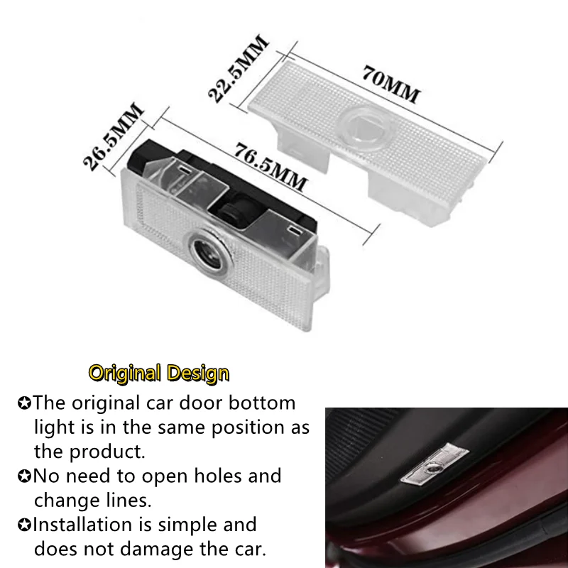 ОсобенностиЭтот светильник-единственный светильник на рынке, который может быть установлен в первоначальном месте и не требует отверстия. И проецируемое изображение-это логотип автомобиля.Этот блок подходит непосредственно к нижней части передней двери и подключен к внутренней цепи освещения, он работает при открытии двери, очень прост и эффективен.Не нужно менять маршрут, и не нужно покупать жгут и без декодирования. Просто снимите оригинальный светильник, а затем установите приветственный светильник.3D лазерный светильник системы входа с подсветкой. Изображение может быть изменено свободно.Отсутствие загрязнения, отсутствие шума, отсутствие электронных помех, водонепроницаемая и пылезащитная конструкция. Прочные и не выцветающие блестящие лучи.