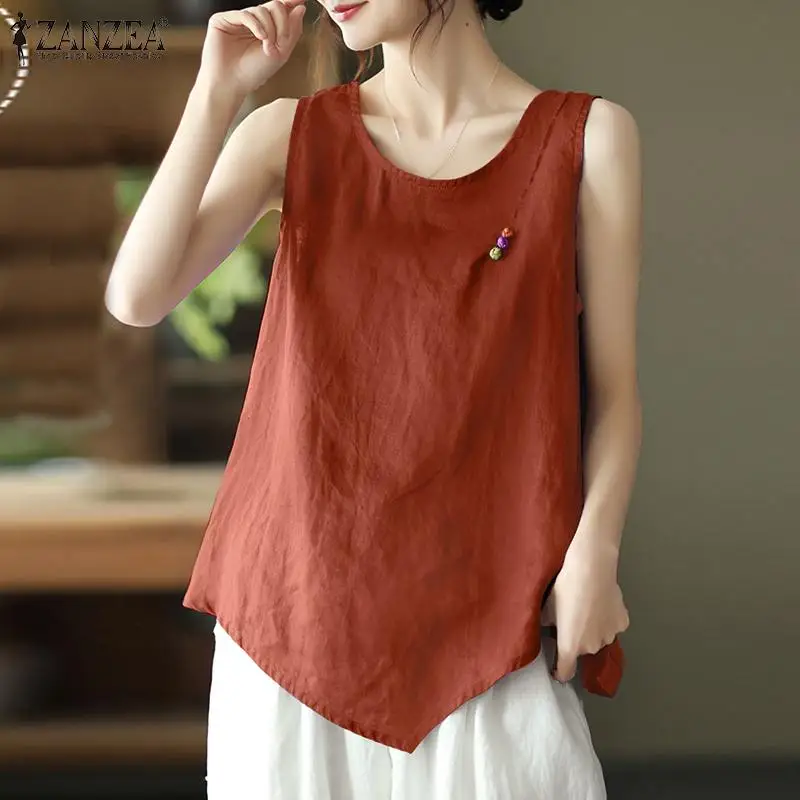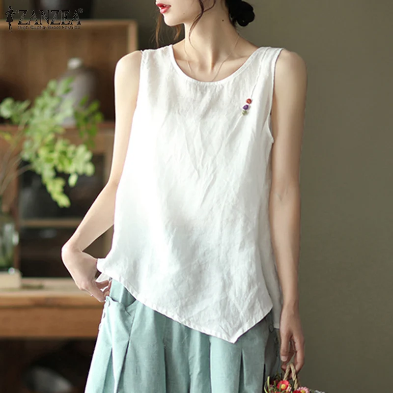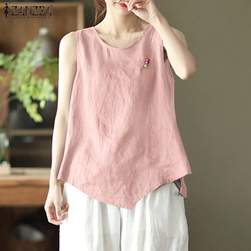 Топ ZANZEA женский асимметричный, винтажная Повседневная Блузка без рукавов, однотонная туника, хлопковая рубашка, большие размеры, на лето
