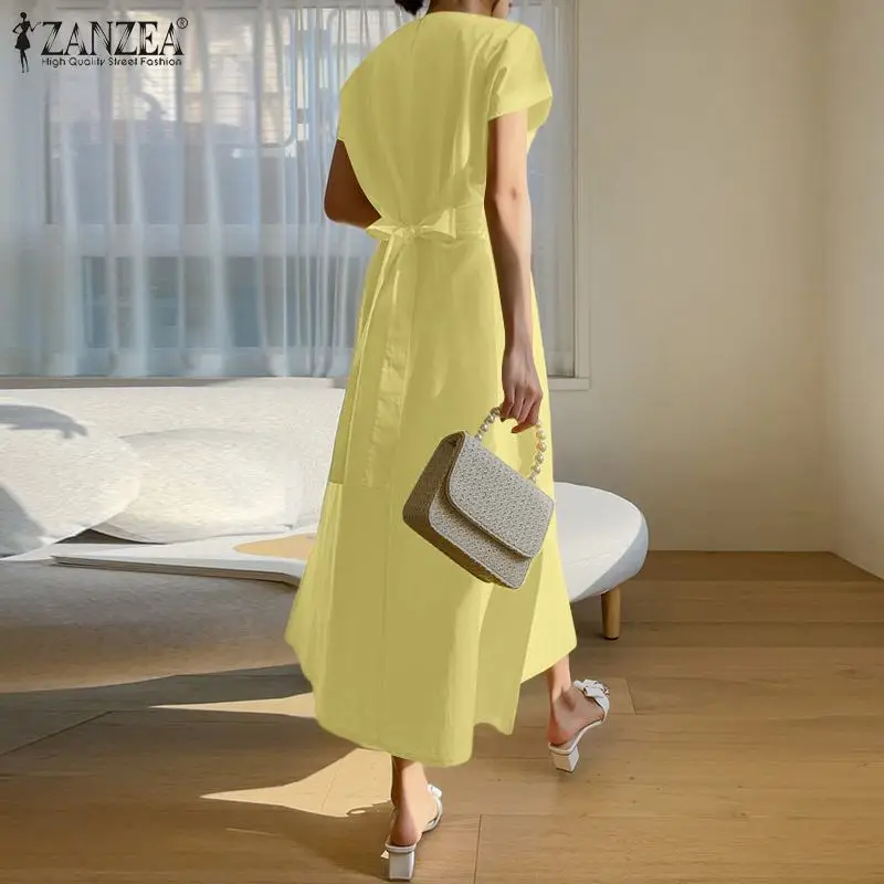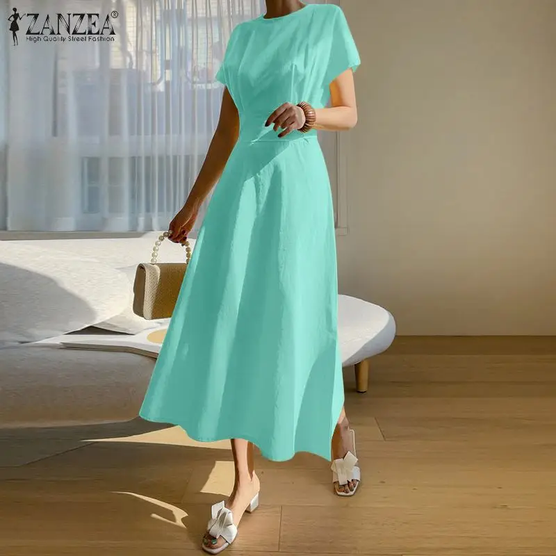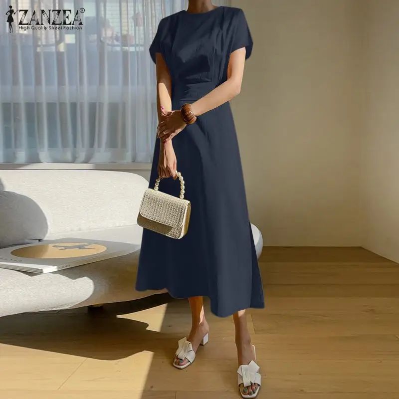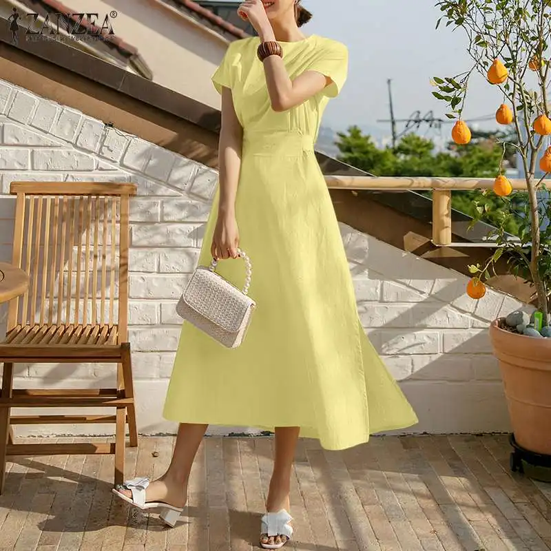 Женский Однотонный сарафан средней длины ZANZEA, праздничный свободный сарафан на молнии с коротким рукавом, летнее платье большого размера