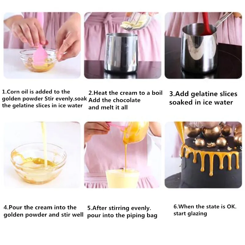 Использование 1. Кукурузное масло добавляется в золотой порошок равномерно. Замочите кусочки желатина в ледяной воде2. Нагрейте крем до кипения, добавьте шоколад и Растопите все3. Добавьте кусочки желатина, смоченные в ледяной воде4. Налейте крем в золотой порошок и хорошо перемешайте5. После равномерного перемешивания. Налейте в мешок трубопровода6. Когда состояние в порядке. Начните остекление Уважаемый клиент: Мы отправляем только на ваш подтвержденный адрес. Пожалуйста, убедитесь, что адрес доставки верен перед покупкой. Все заказы будут отправлены в течение 1-2 рабочих дней после подтверждения оплаты. Обычно это занимает 15-45 рабочих дней (некоторые страны могут быть намного дольше), если вам нужны товары очень срочно, пожалуйста, свяжитесь с нами для DHL и т. д. Мы рассчитаем стоимость доставки для вас. Доставка занимает 3-7 дней!
