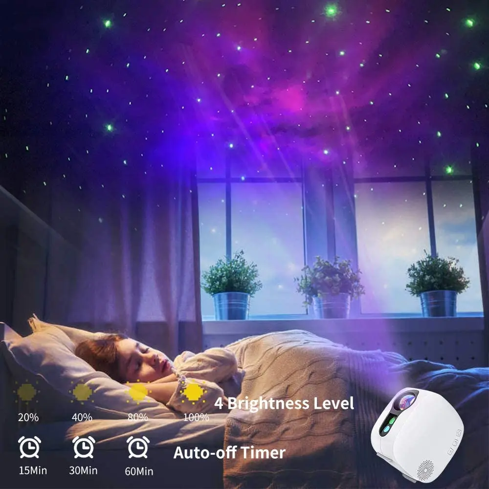 Различные режимы освещенияНочной светильник-проектор работает так, как вам нравится-только туманность, туманность + звезда, туманность + луна, туманность + звезда + луна, только звезда. Они могут быть статичными или движущимися, быстрыми или медленными, создавая чудесную атмосферу для вас. Легко управлятьЛегко управлять различными функциями с помощью клавиш на проекторе. Кроме того, вы также можете свободно управлять проектором с помощью предоставленного пульта дистанционного управления. Встроенный Bluetooth музыкальный динамикПроектор star подключает ваш смартфон через Bluetooth, а затем воспроизводит любимую музыку или рассказы. 3 варианта автоматического выключения таймераНочной светильник-проектор оснащен таймером автоматического отключения 15 минут/30 минут/60 минут, чтобы обеспечить вам удобный энергосберегающий способ, который вам не нужно беспокоиться о том, чтобы забыть выключить светильник, когда вы засыпаете. 4 уровня яркостиНочной светильник star можно регулировать на 4 уровня яркости, чтобы создать спокойную и согревающую атмосферу сна для вас и ваших детей. Что в вашей коробке:Ночник-светильник-проектор-1 шт.1 х пульт дистанционного управления1 x Руководство пользователя1 х адаптер питания переменного тока1 х USB кабель для зарядки