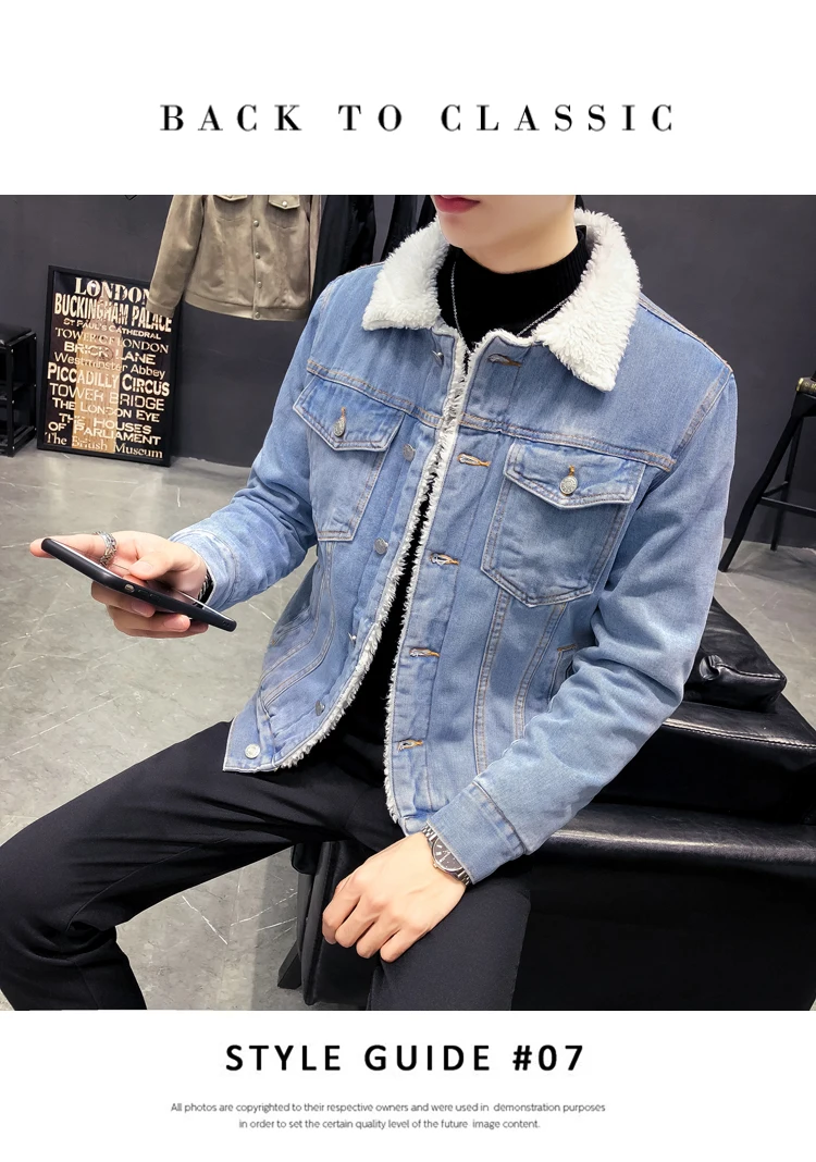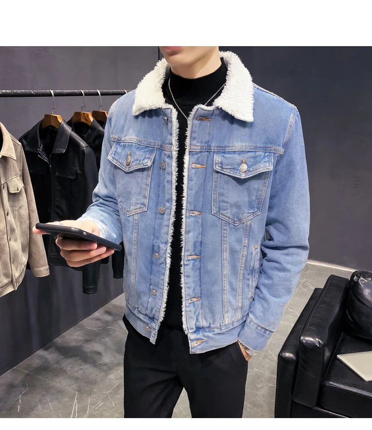 Мужская джинсовая куртка, светло-голубая облегающая куртка из плотной джинсовой ткани, размеры с теплой шерстяной подкладкой, для зимы, S-6XL