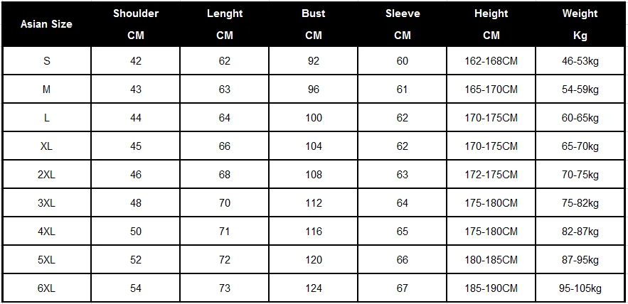 Asian sizeS M L XL XXL 3XL 4XL 5XL 6XL