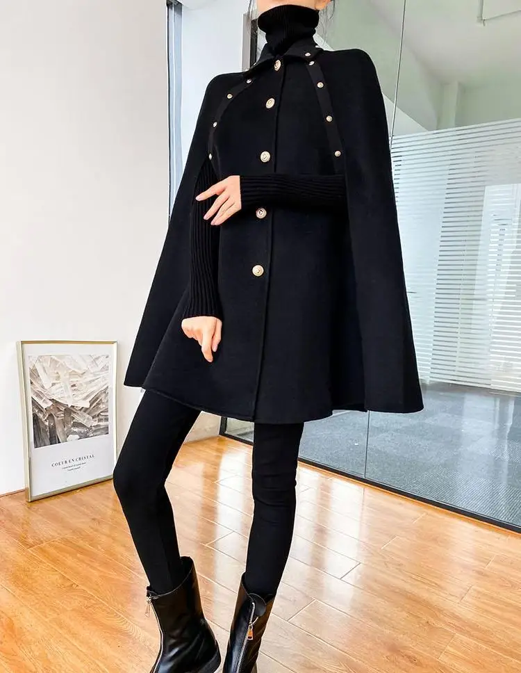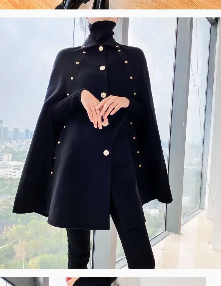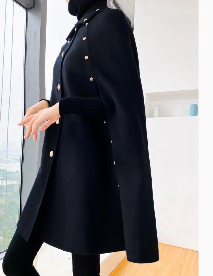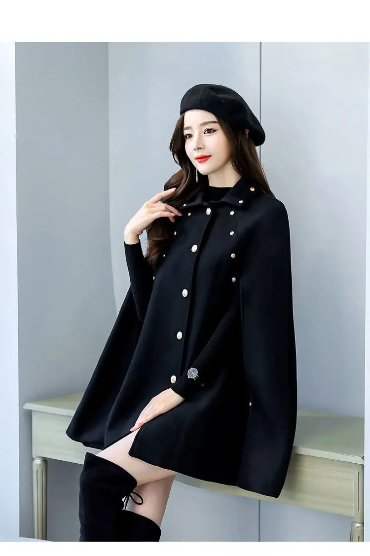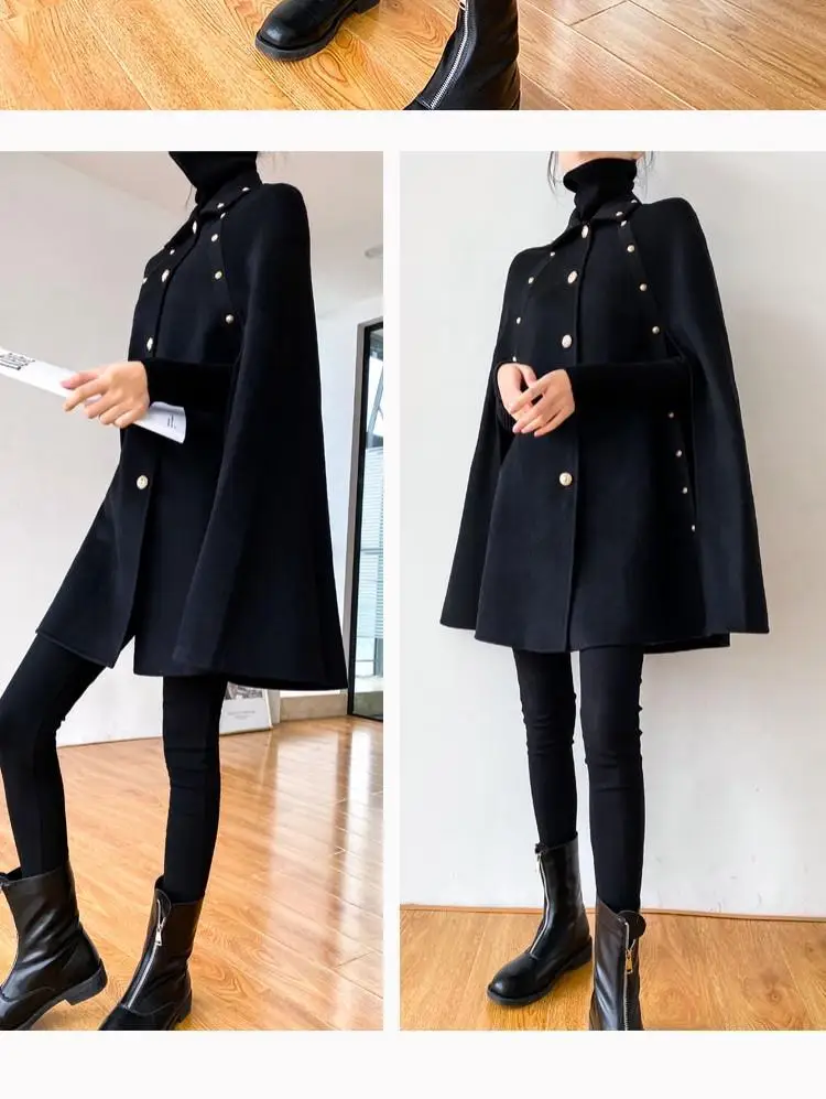 Черная шерстяная накидка, тканевое пальто, женское пончо, Осень-зима 2021, средняя длина, свободный винтажный плащ, верхняя одежда, модная женская шаль на пуговицах
