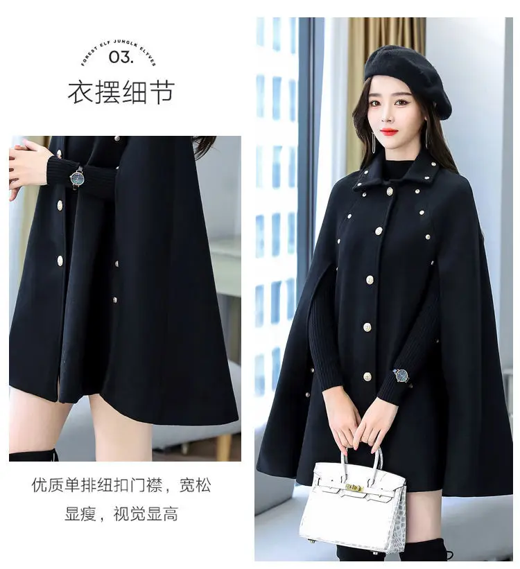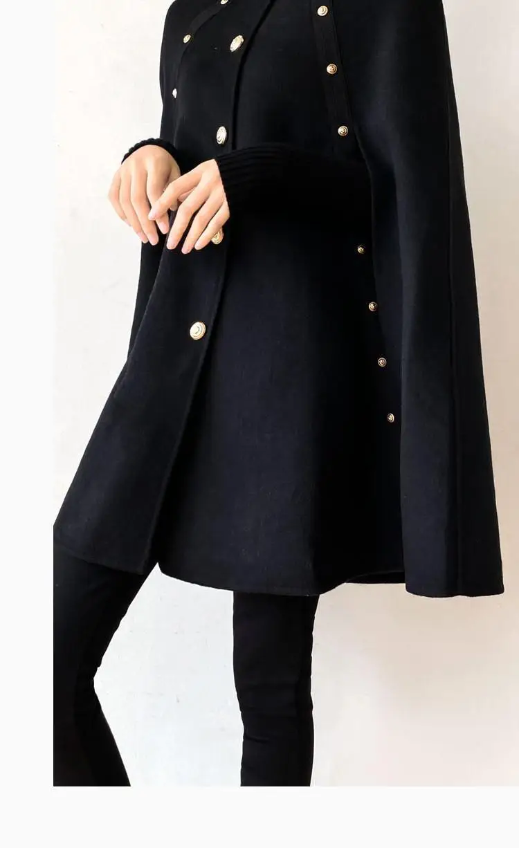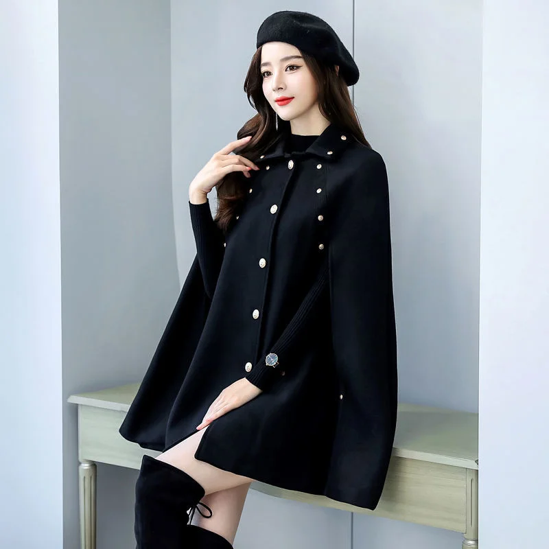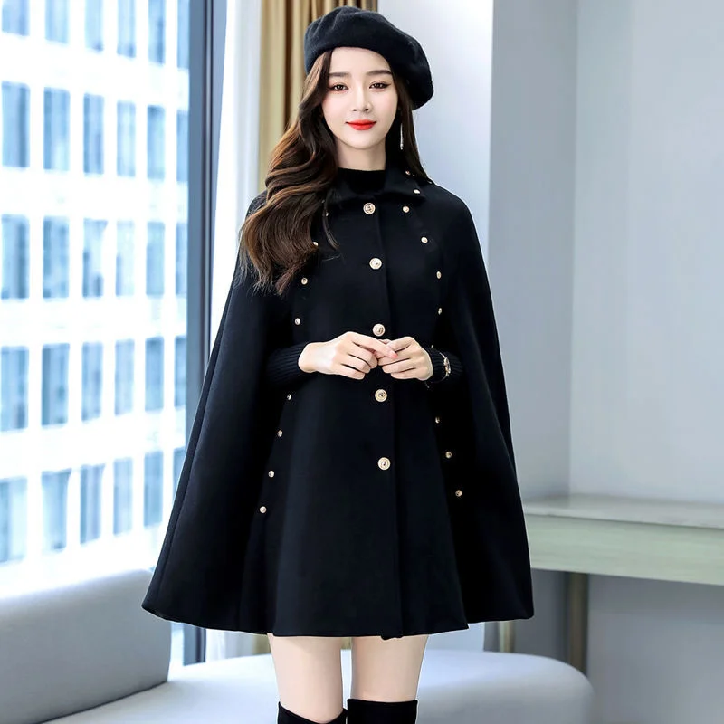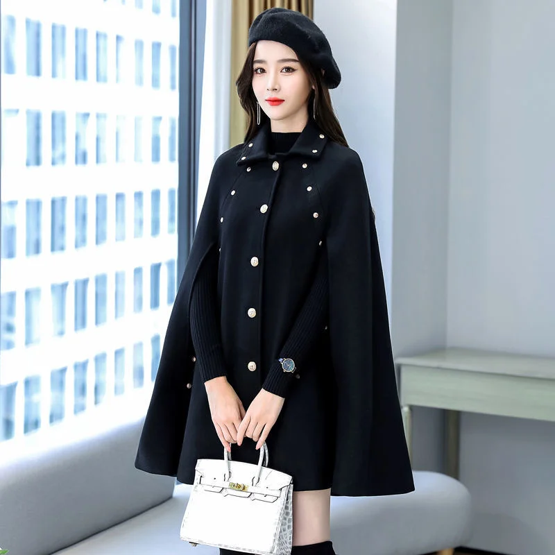 Черная шерстяная накидка, тканевое пальто, женское пончо, Осень-зима 2021, средняя длина, свободный винтажный плащ, верхняя одежда, модная женская шаль на пуговицах