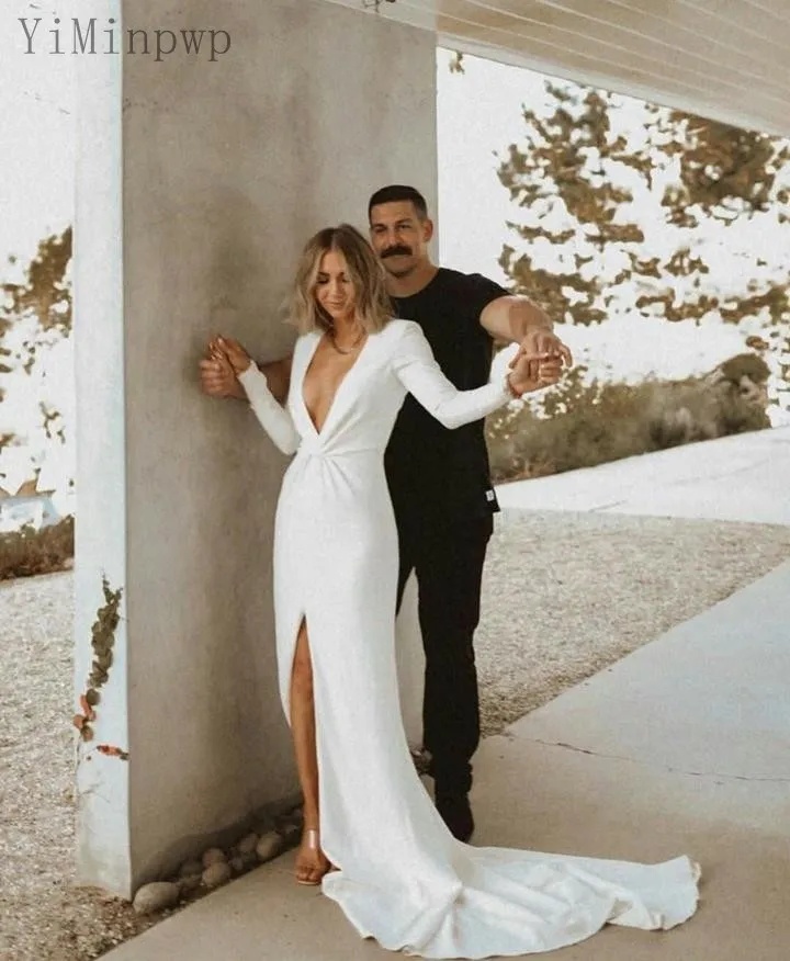 Свадебные платья YiMinpwp с глубоким V-образным вырезом, длинным ру...