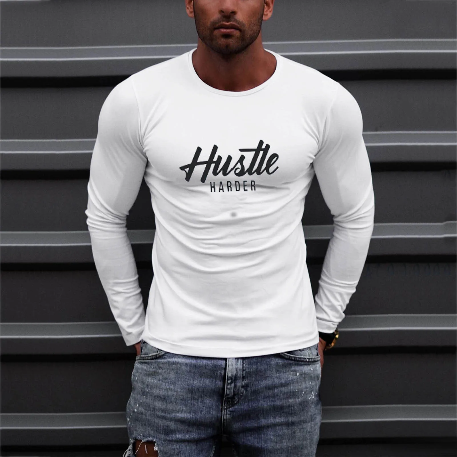 Мужская облегающая Повседневная футболка с круглым вырезом и длинными рукавами с буквенным принтом, топ, модная футболка, большие размеры, 2021